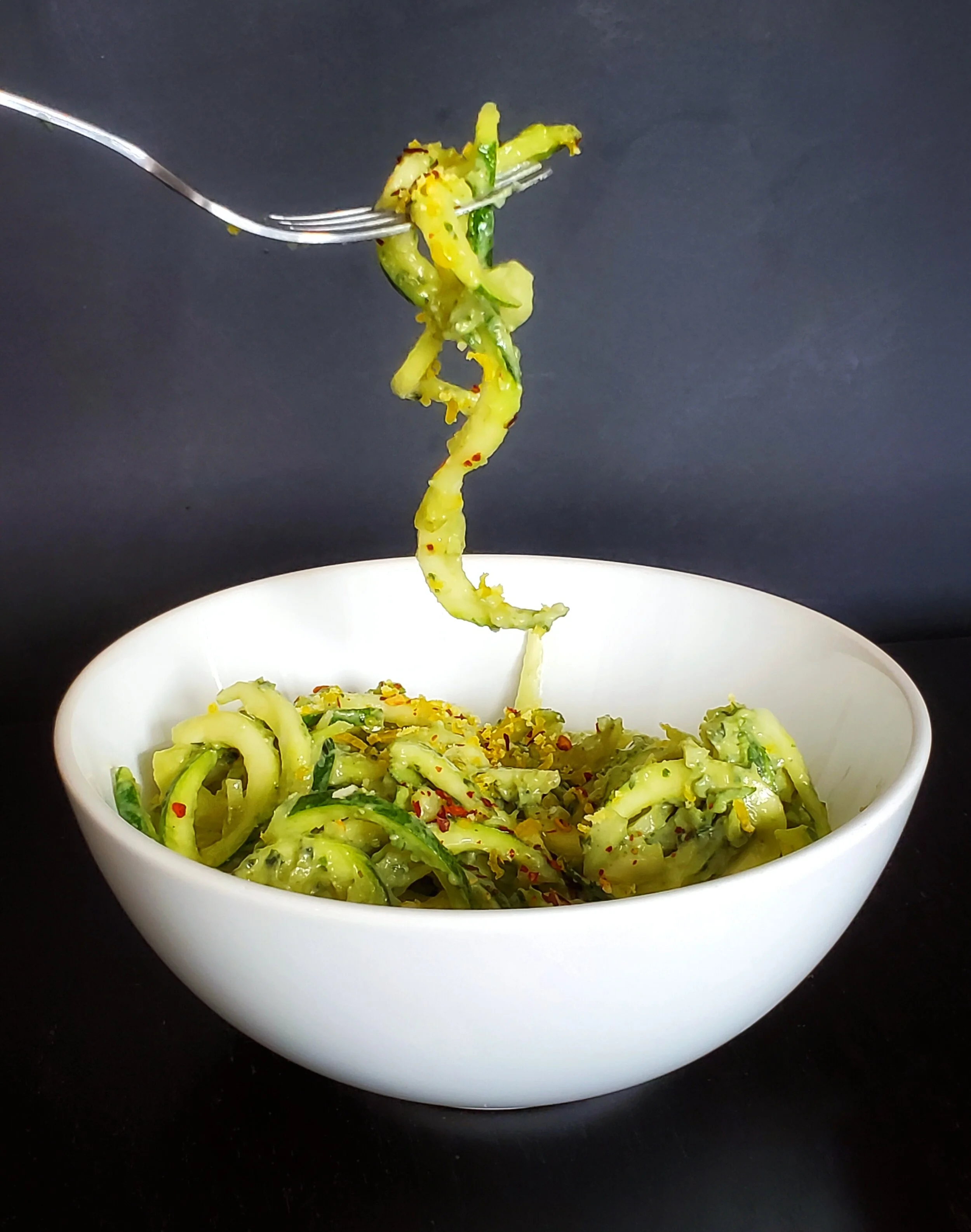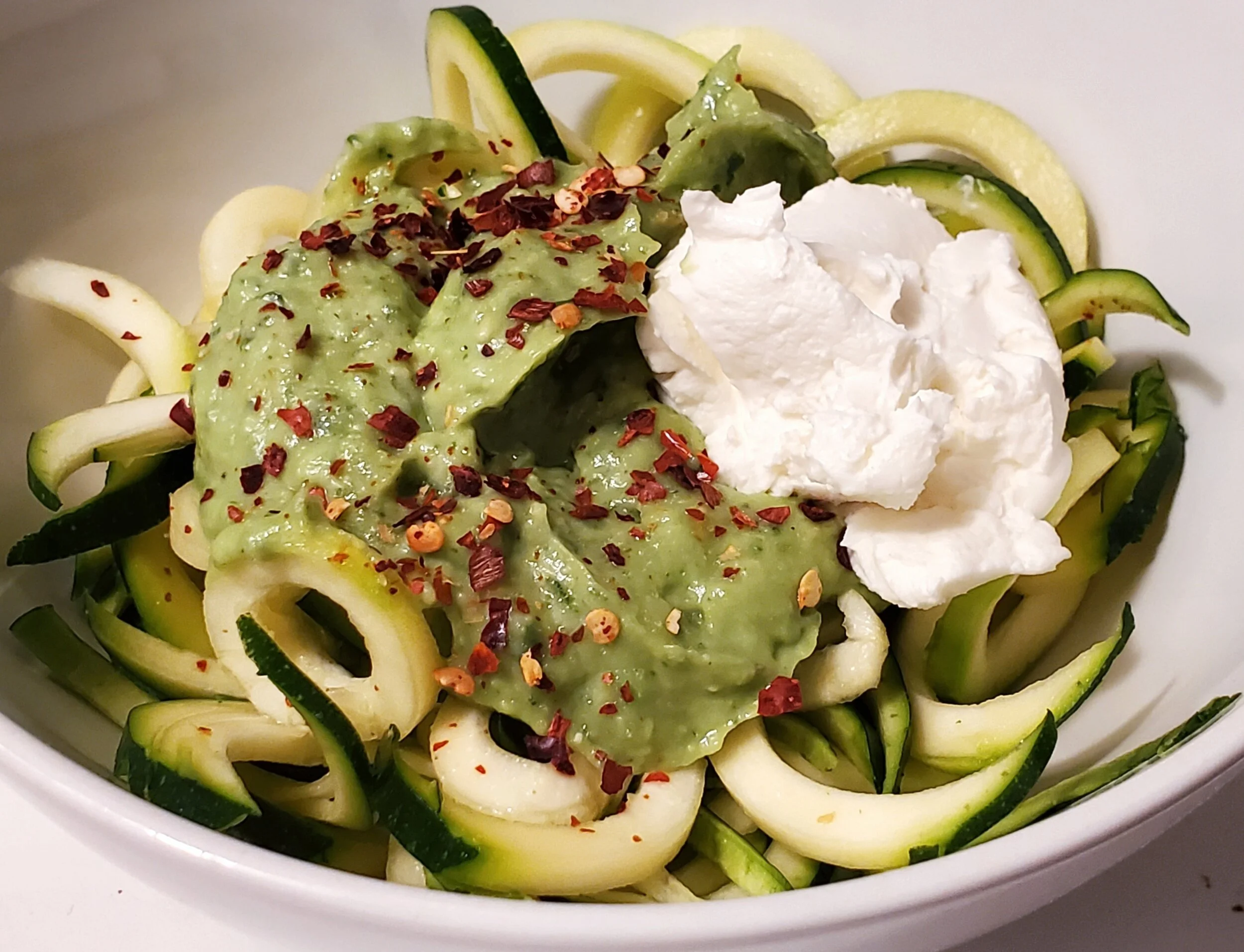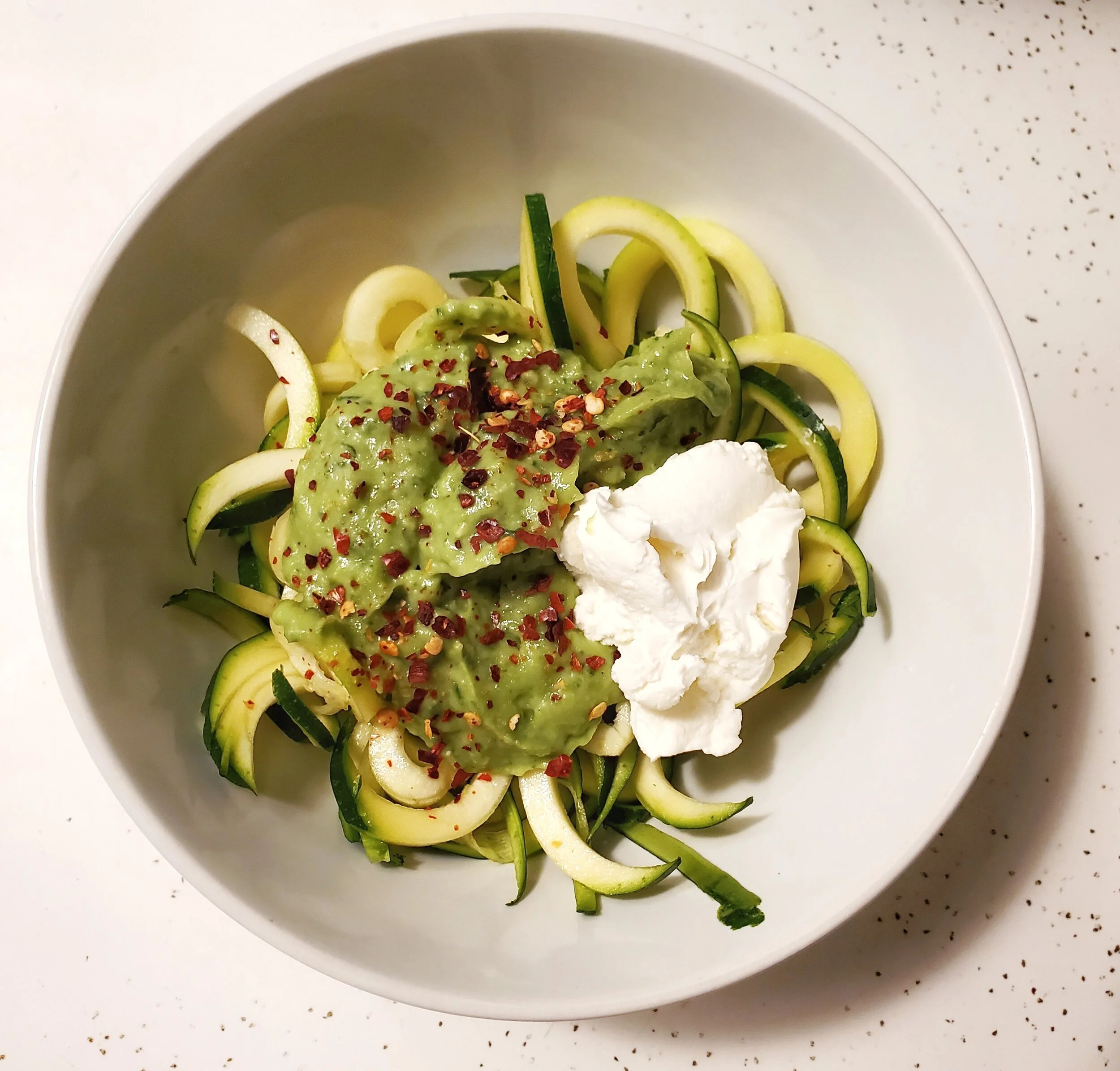 - Serve the avocado pesto over zoodles. Optionally, garnish with some red chili flakes.