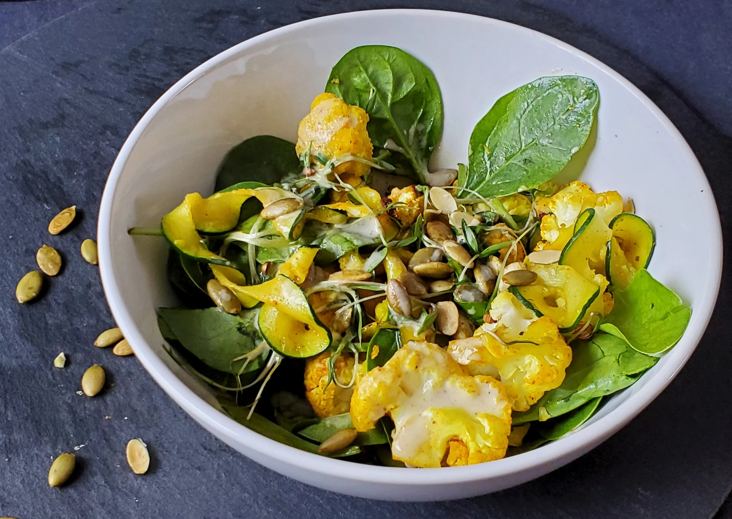 Now I still enjoy all that yum, just skipping the grains and sticking to low carb veggies, like with this amazing curreid cauliflower and zucchini salad.
