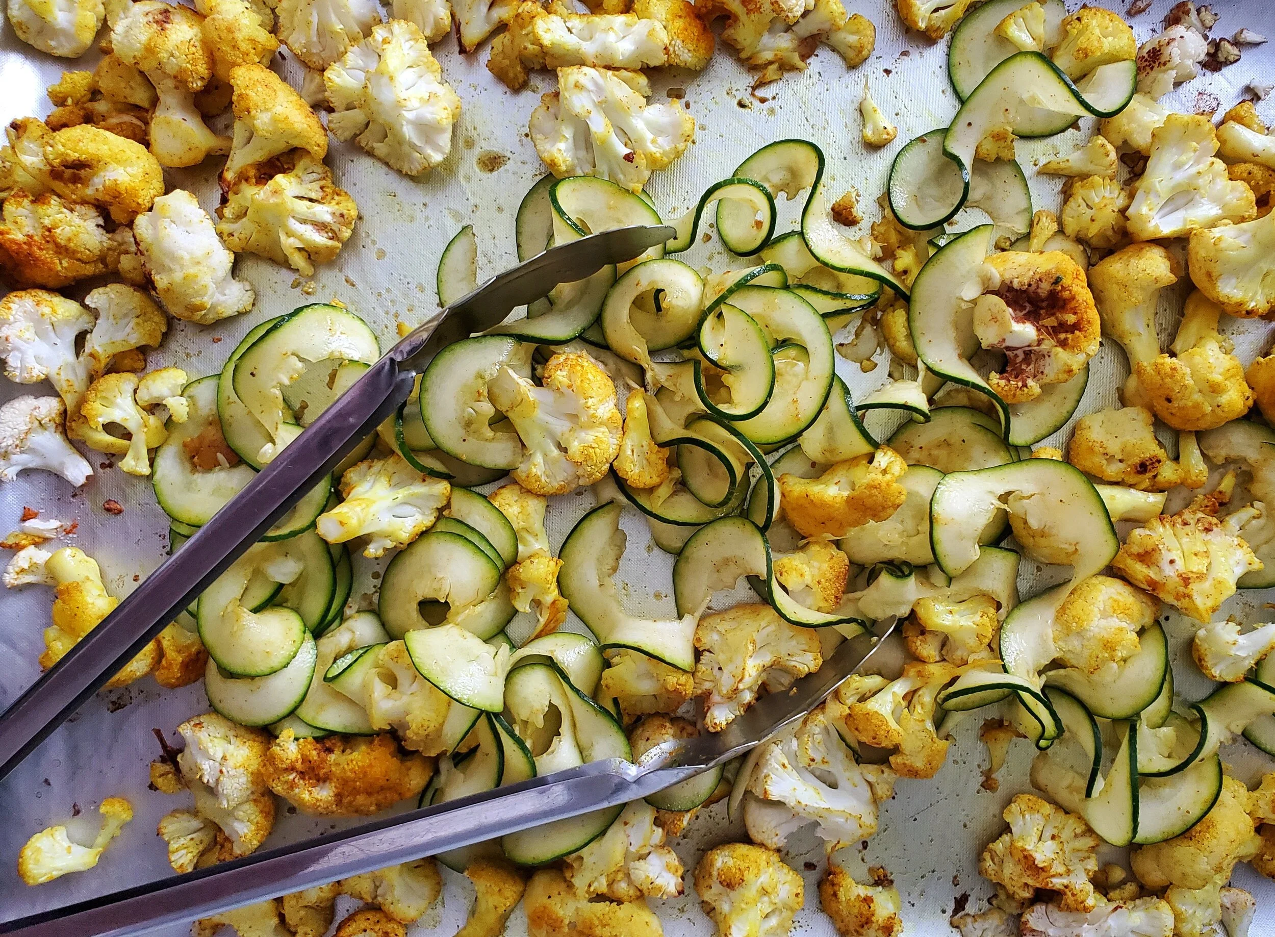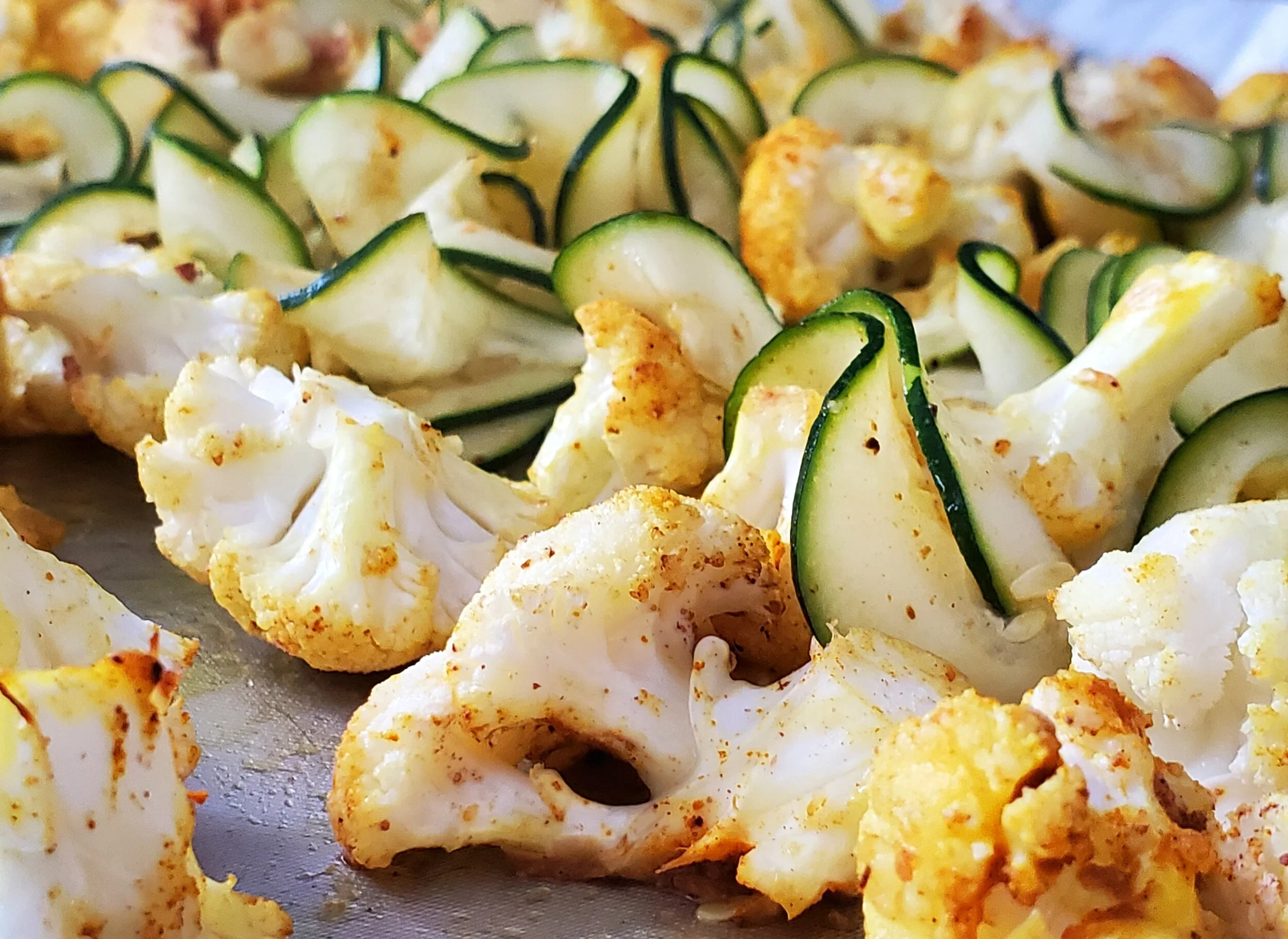 Remove the cauliflower from the oven, add the zucchini and toss. Bake for another 10 min.