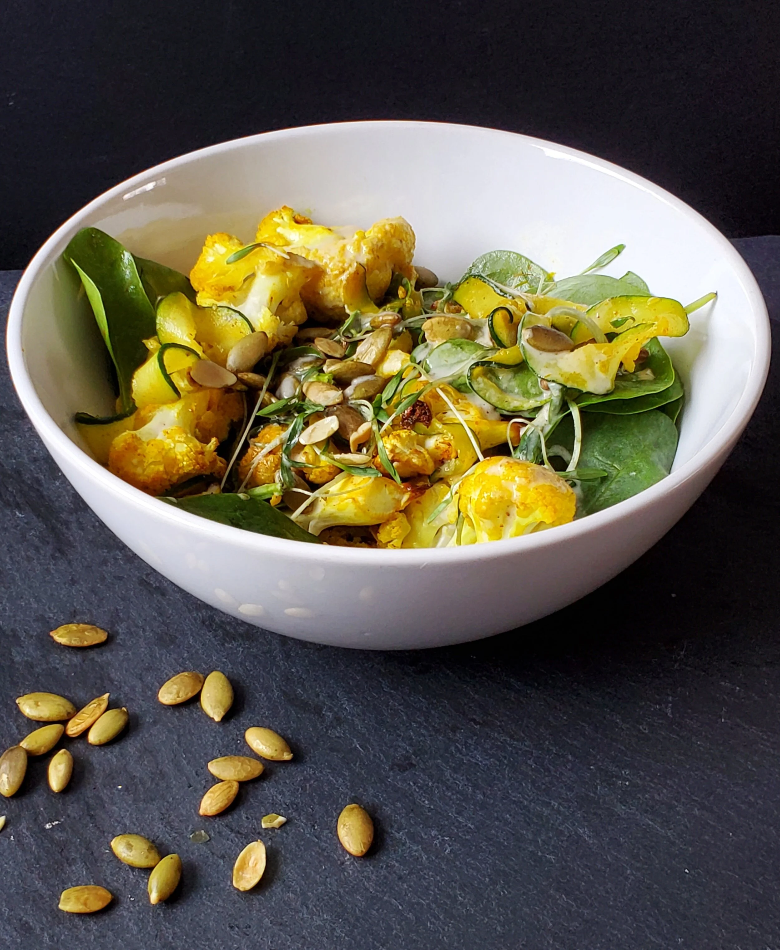 Toss the cauliflower florets in olive oil, turmeric and garam masala. Spread out the florets on a parchment lined baking sheet and bake for 15 min.