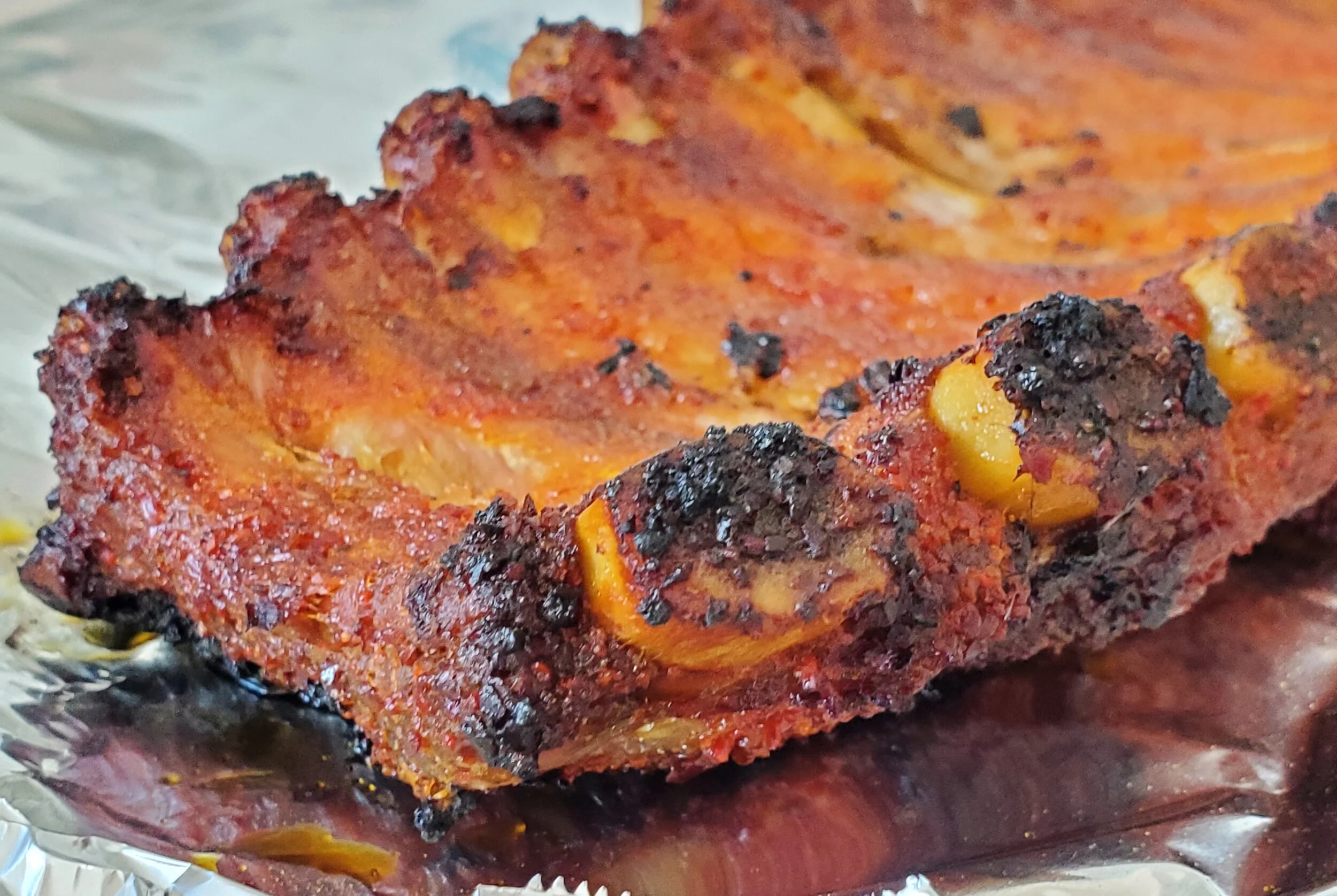 - Pull the pork ribs out of the oven, remove the top sheet of aluminium and return to the oven at broil for 2-3 min to grill the top.