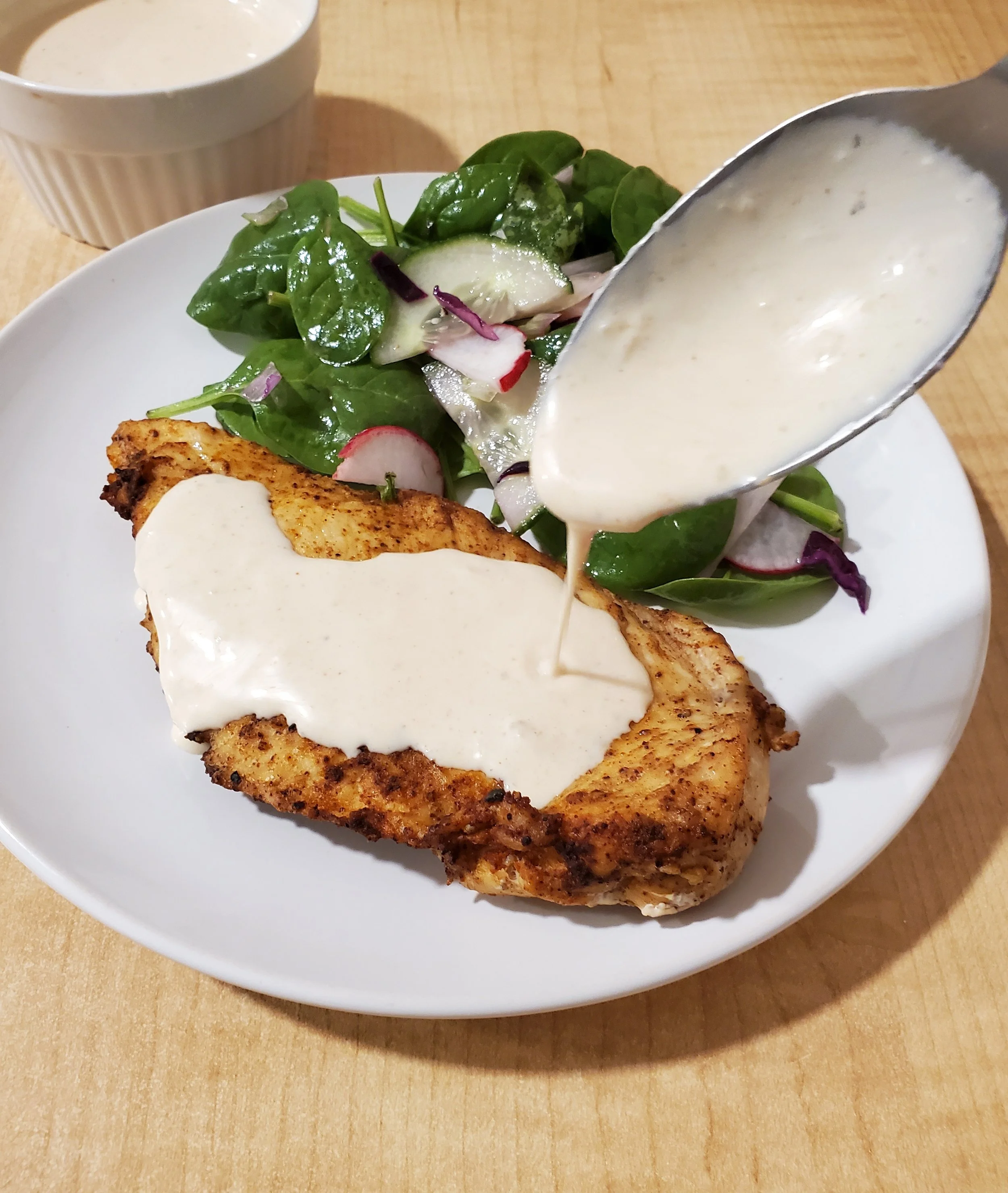 Bake for 25-30 min. While the chicken roasts, prepare the Alabama white sauce.