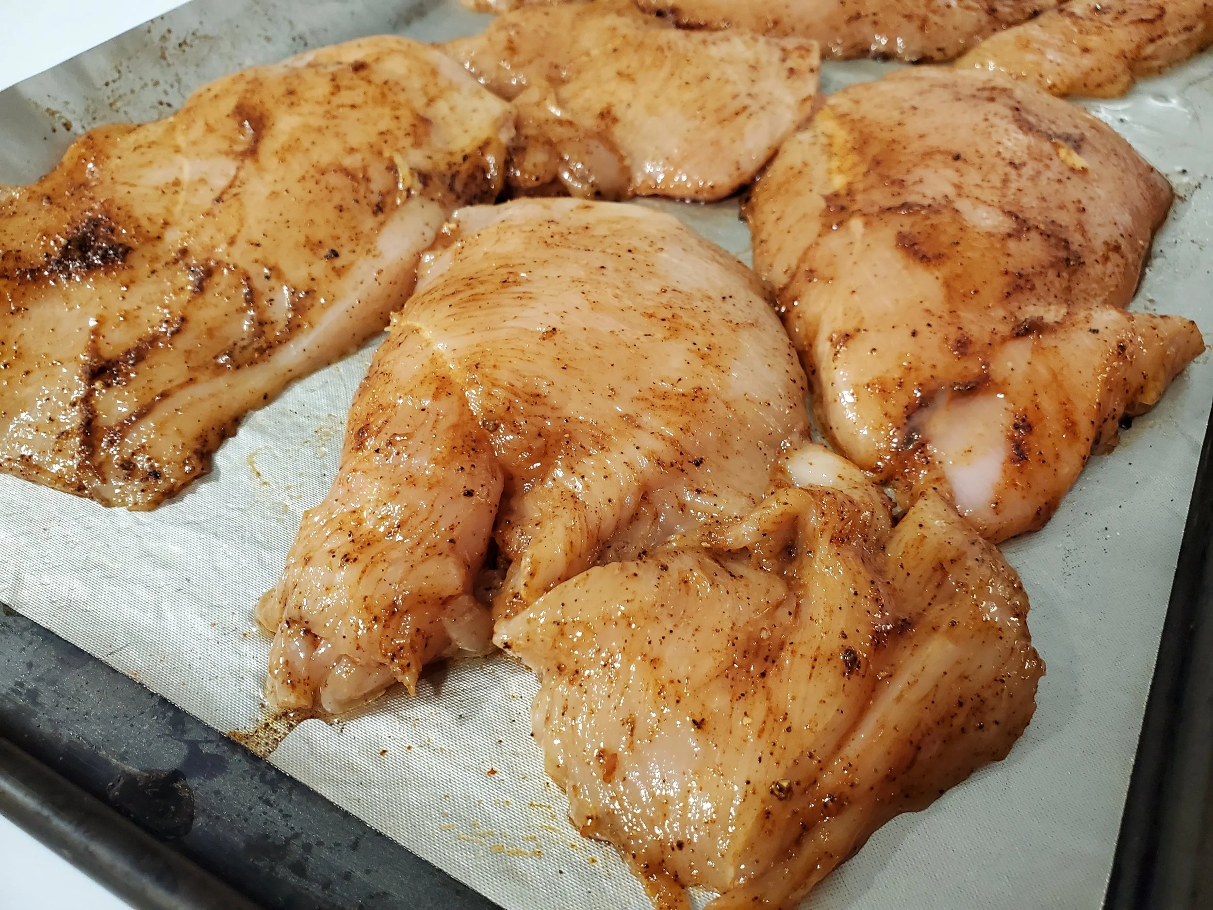 - Drizzle with the avocado oil, then sprinkle with the seasoning and rub on both sides of each slice of chicken breast.