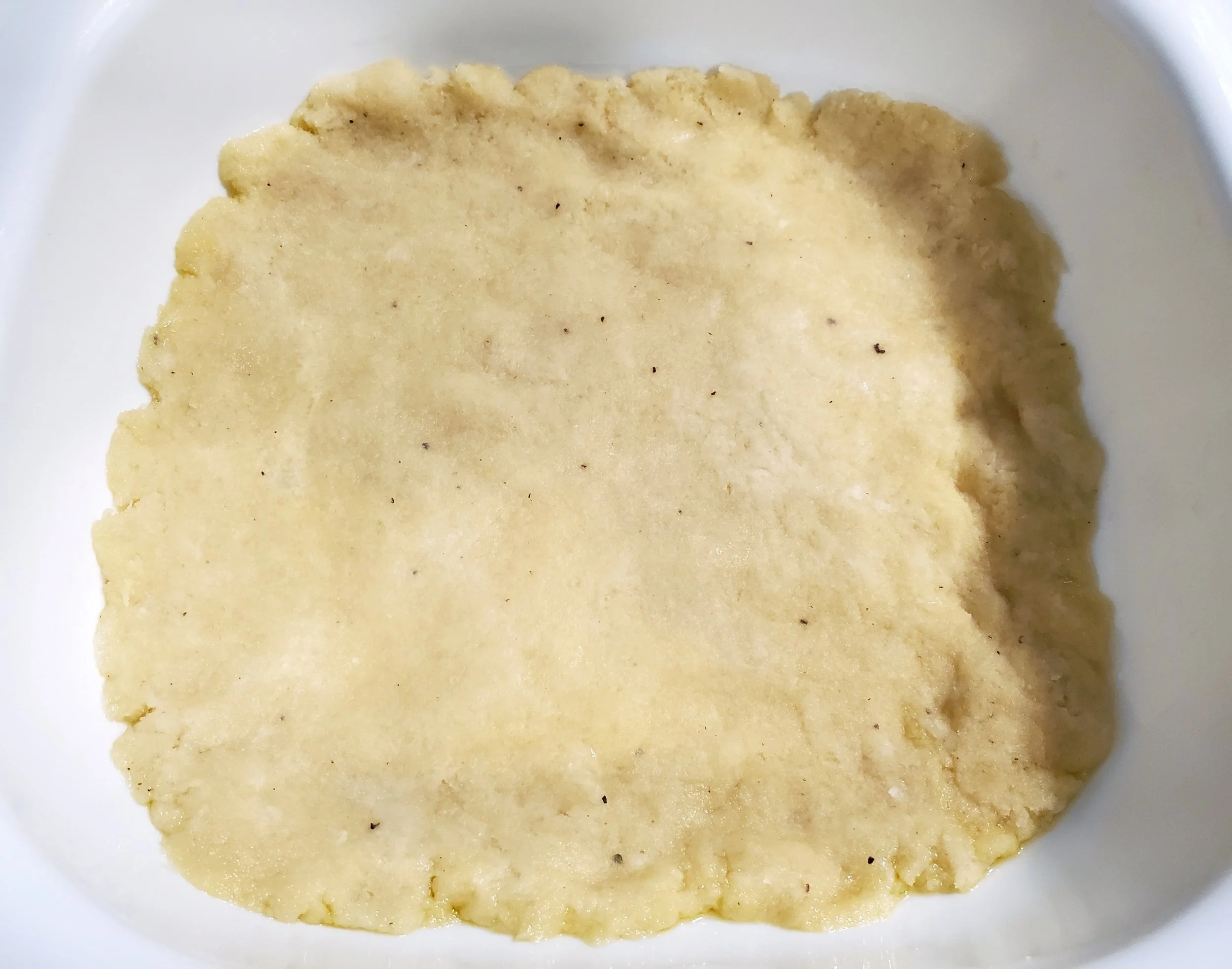 Transfer the fathead dough to the baking dish and, using your fingers, spread it out thin, working it up the edges to create a deep dish crust.