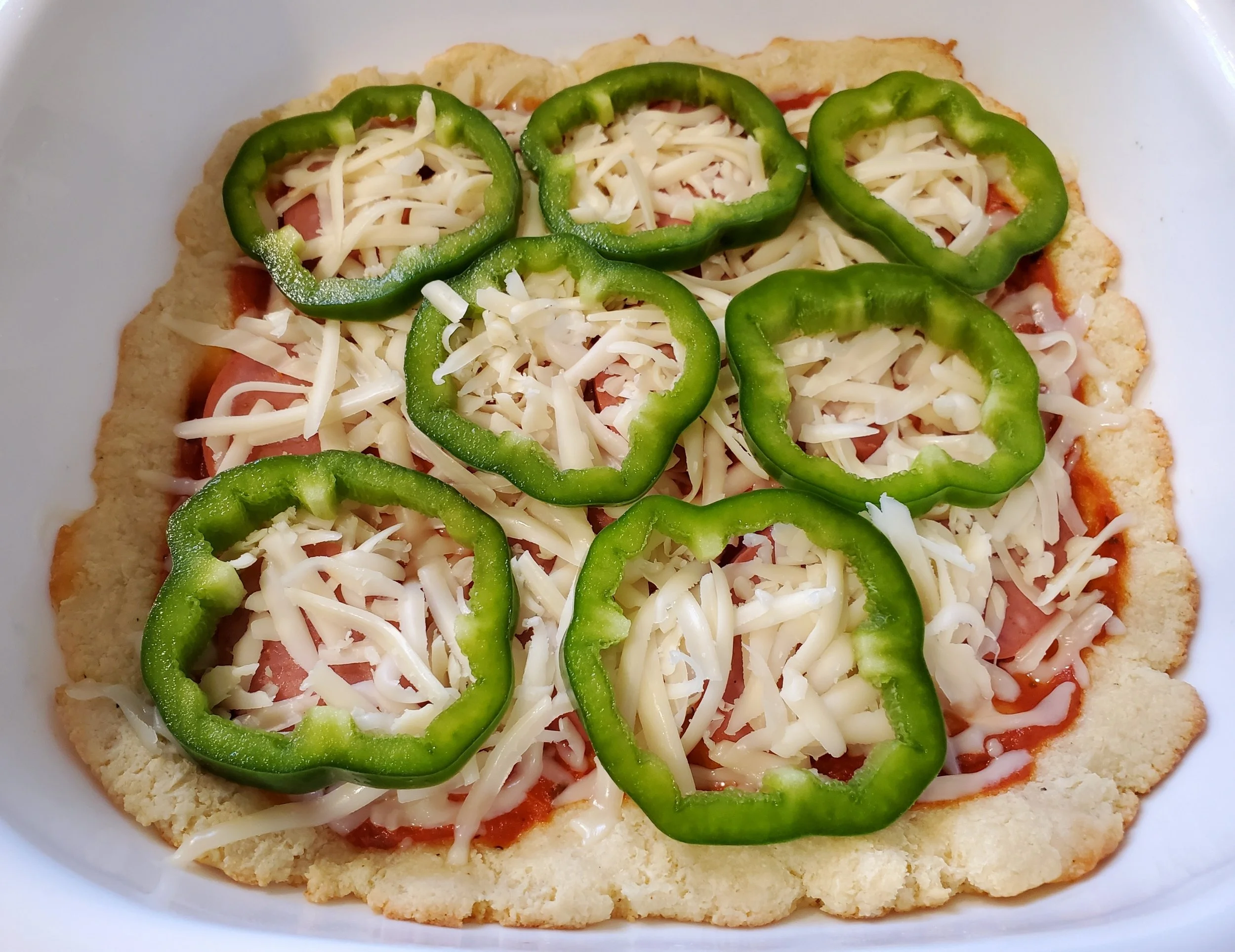- Pull the baking dish out of the oven. Spread the tomato or pizza sauce over the crust, top with the pepperoni, mozzarella and slices of green bell pepper.