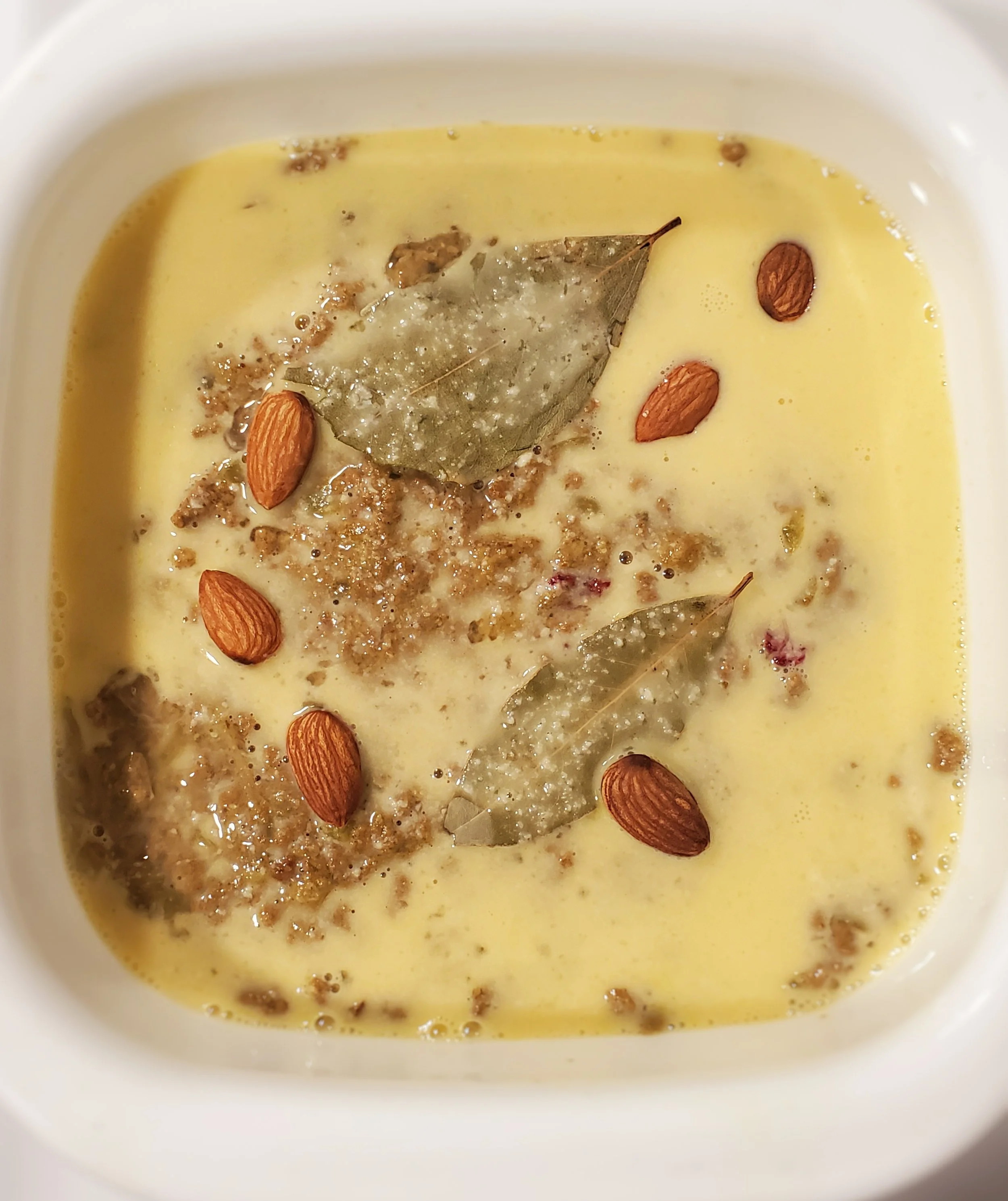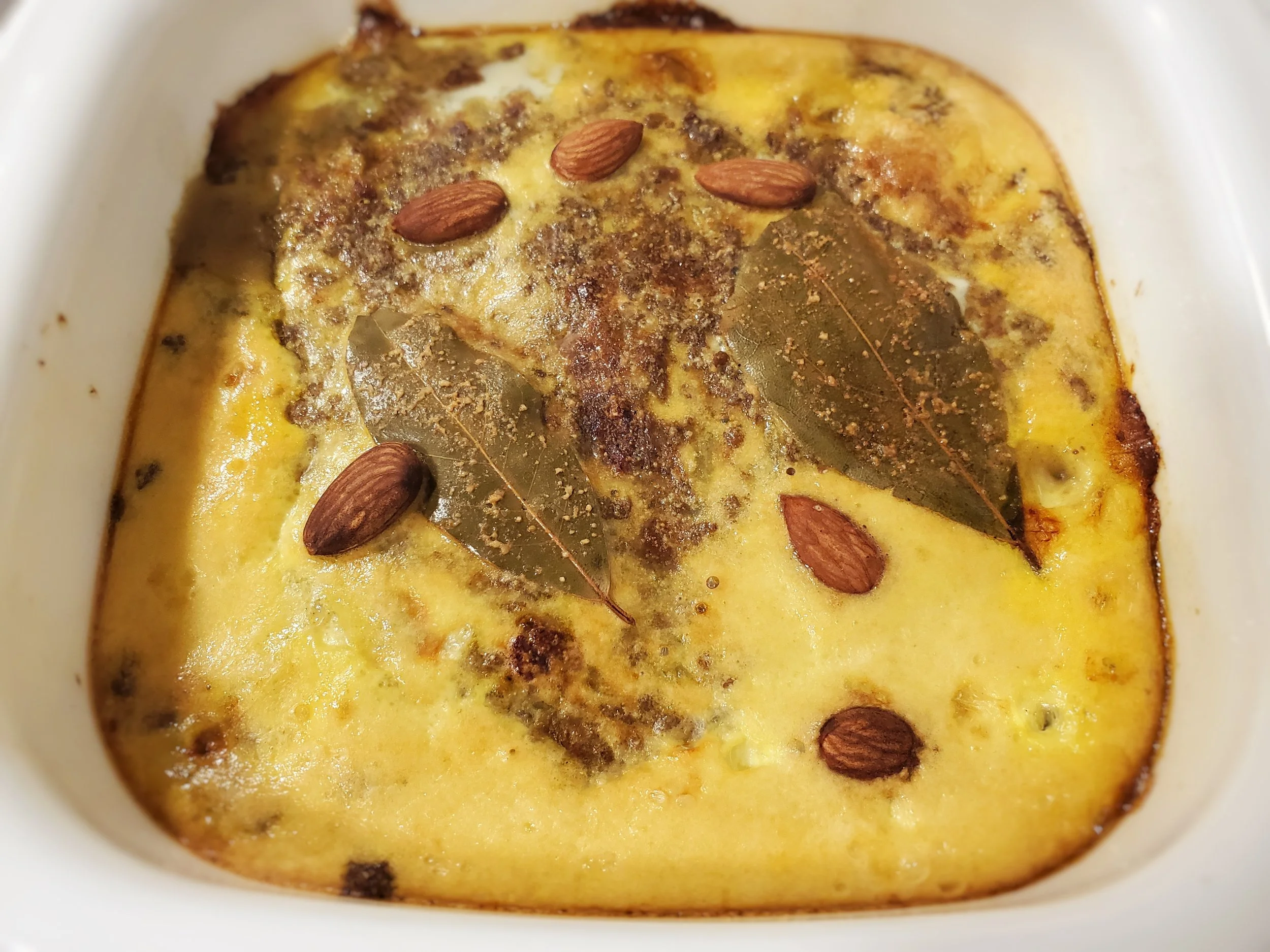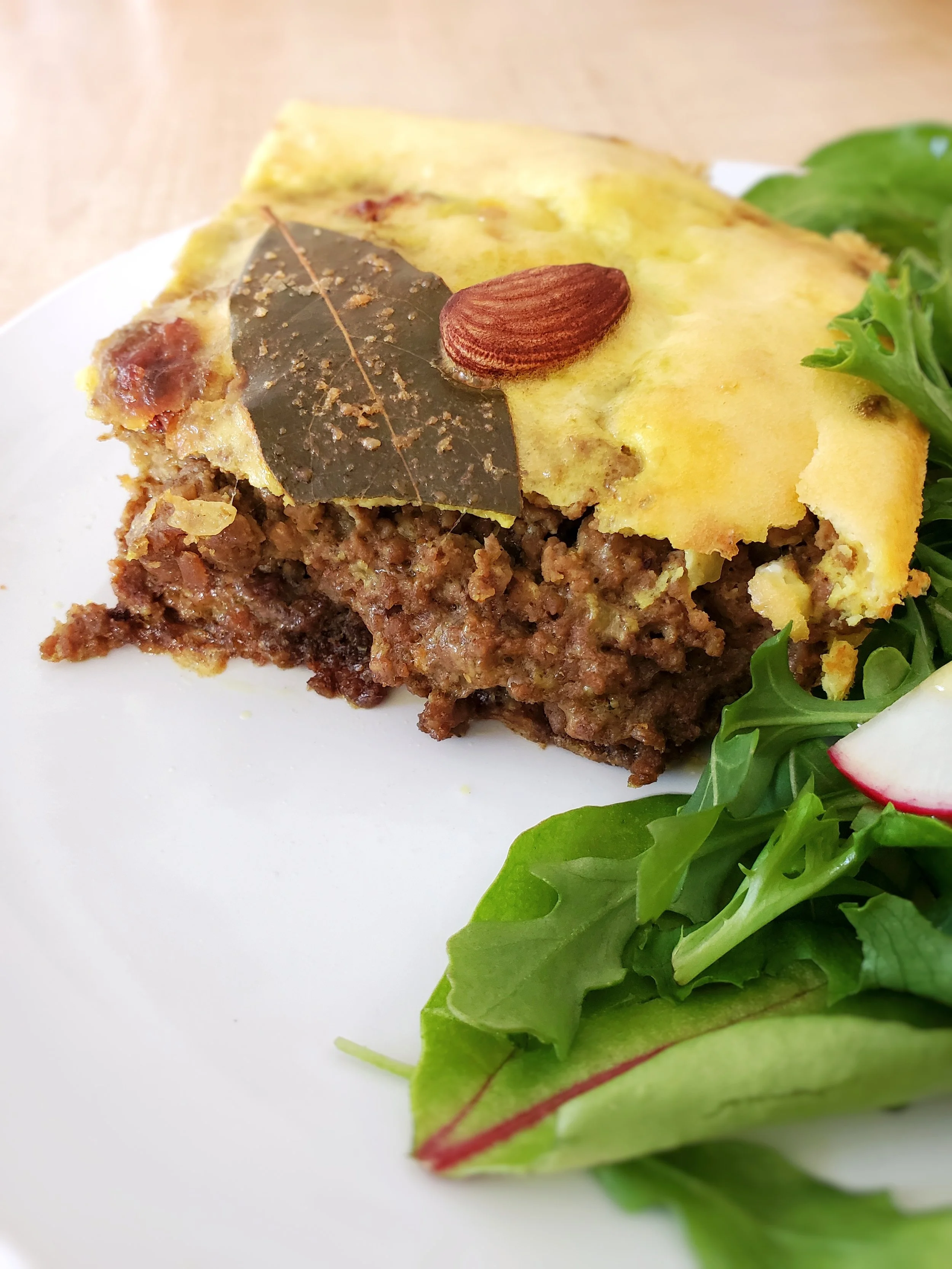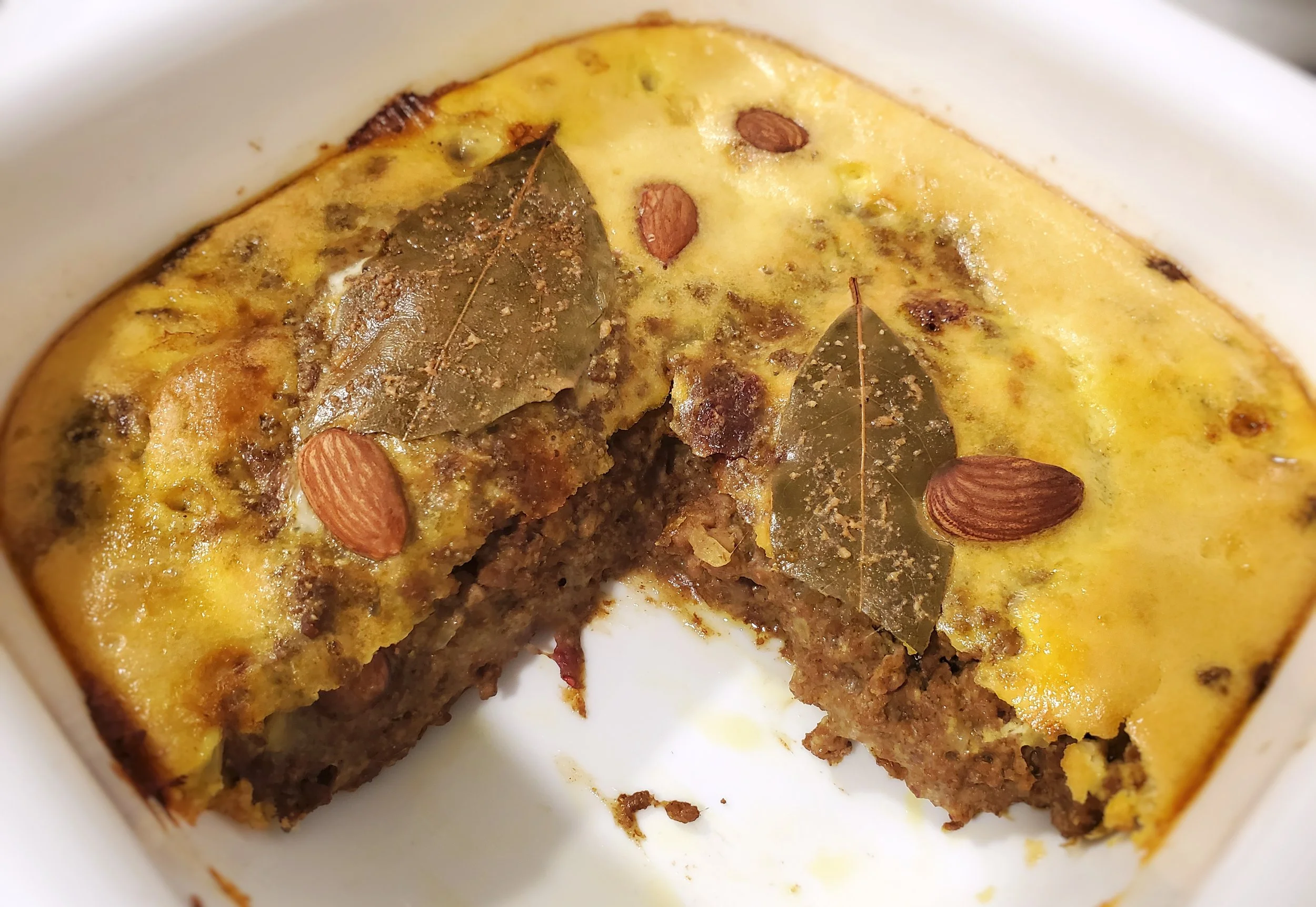 Pour the egg mixture over the ground beef, then top with the bay leaves and, optionally, a few almonds.