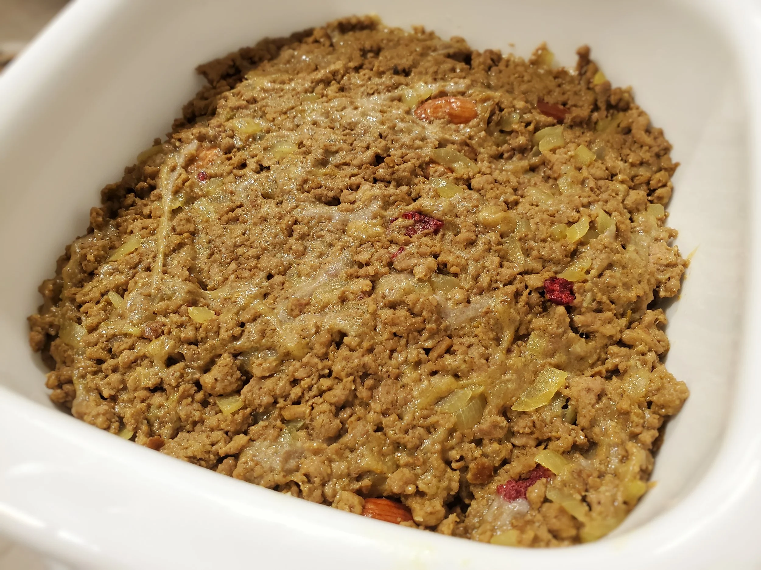 NOTE: Tradionally, bobotie is made with dry raisins, which I like to substitute with dehydrated raspberries. I prepare these by placing fresh raspberries in my dehydrator for 3-4 hours, then use them in recipes.