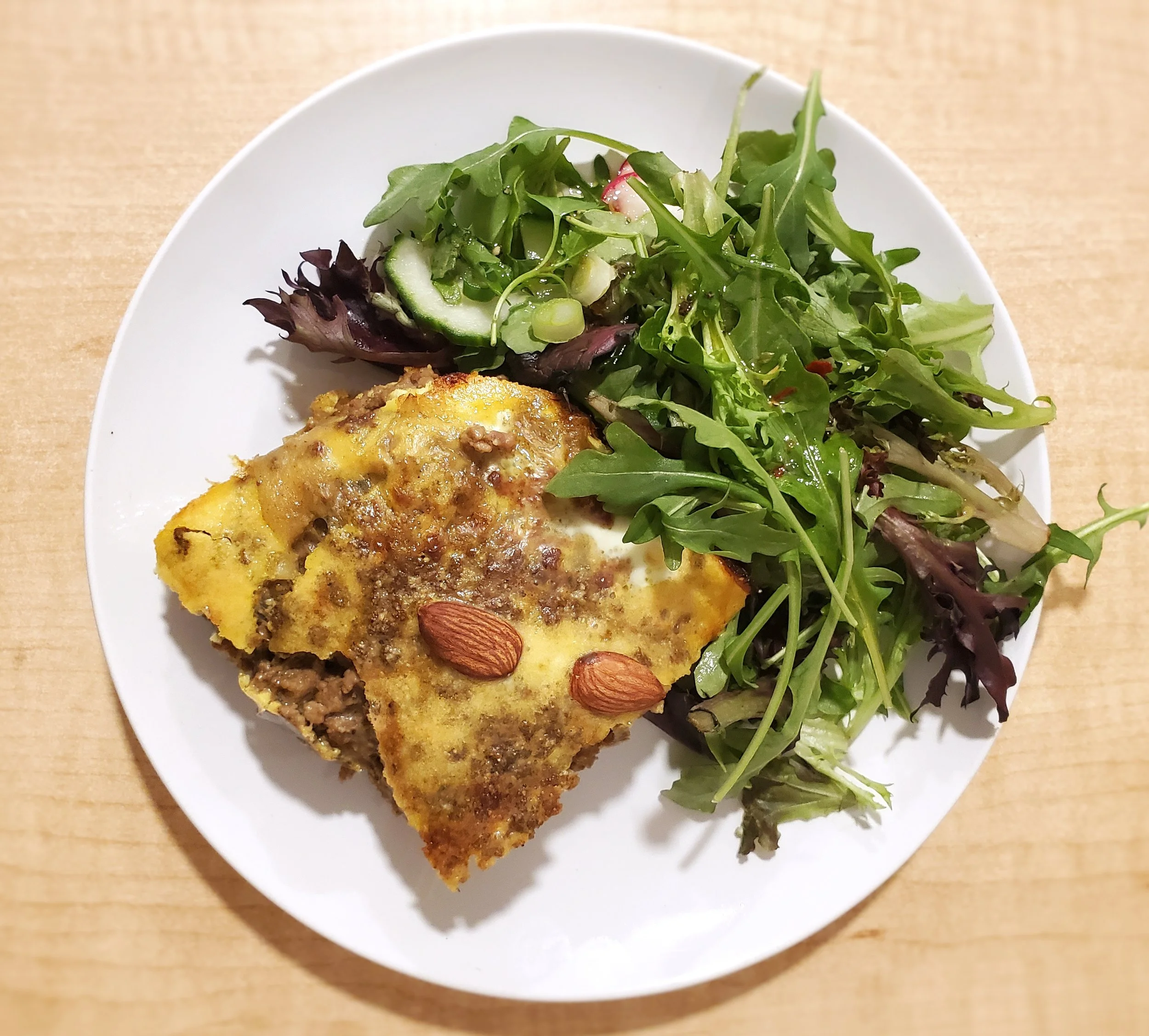 While the meat is browning, in a medium bowl, beat together the almond milk, remaining 1 Tbsp almond flour and the eggs. Set aside.