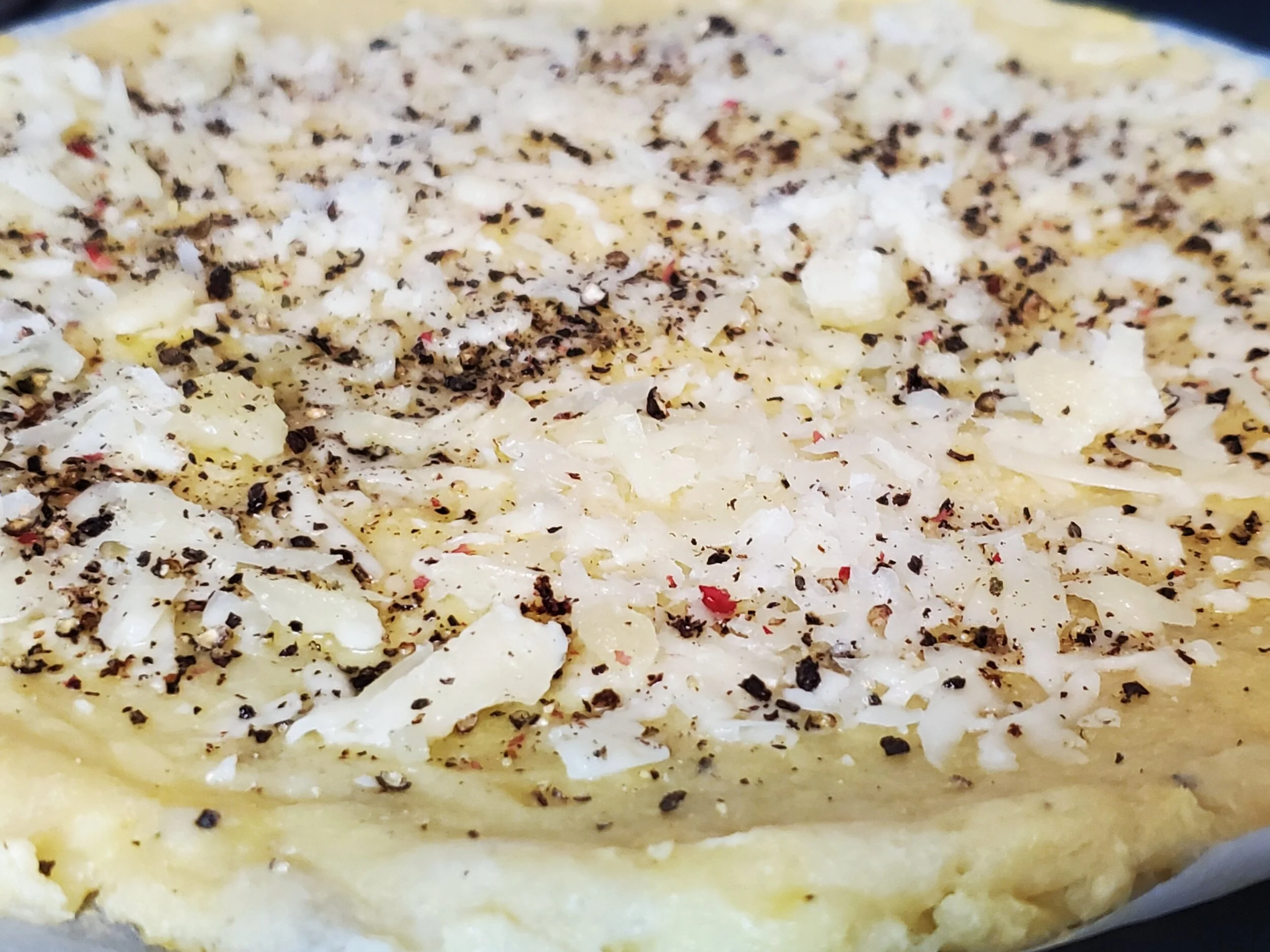 Remove the crust from the oven. Top with the grated butter and pecorino romano. The pecorino can also be substituted wth parmigiano reggiano, as both work well here.
