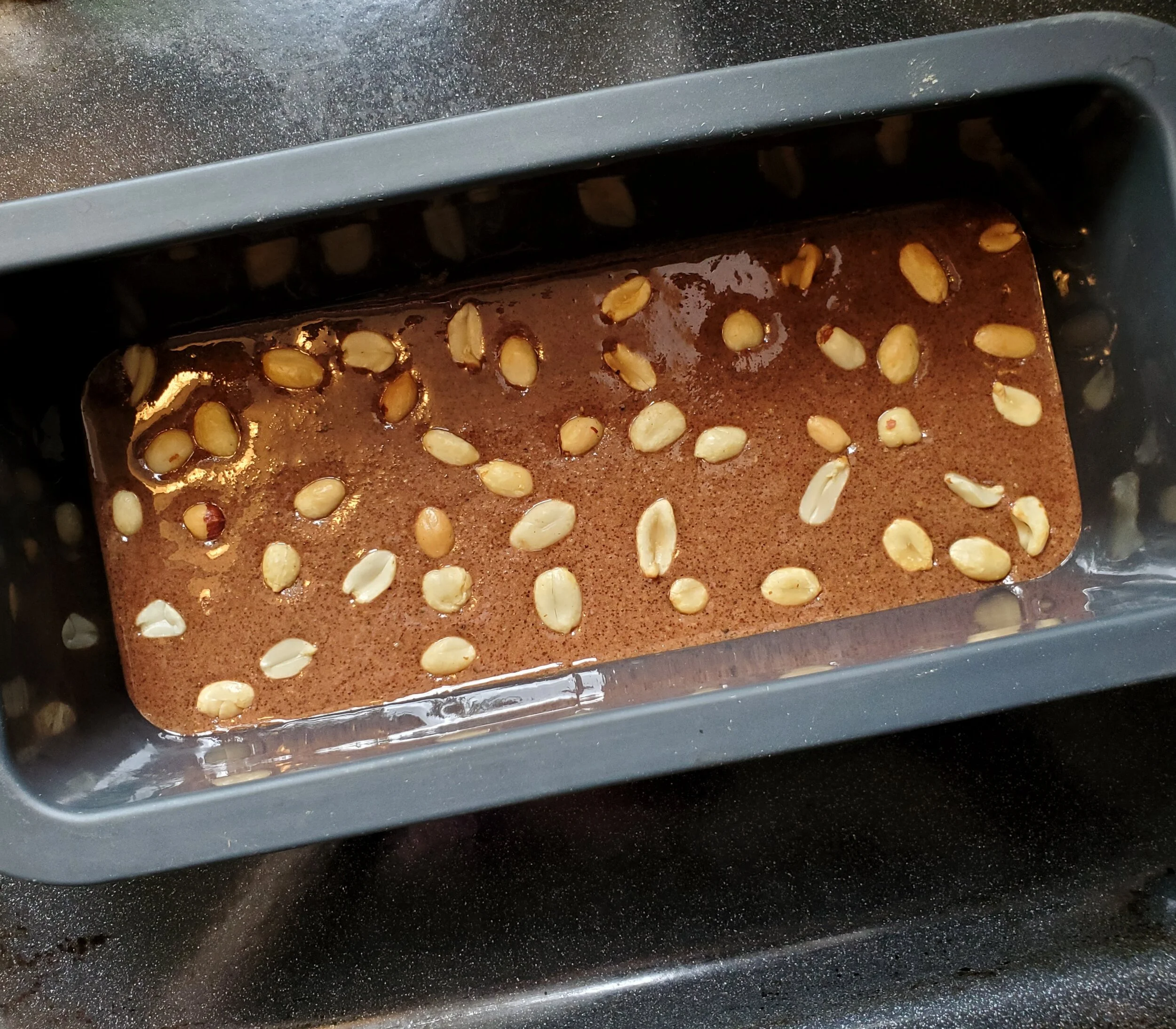 - Sprinkle the roasted peanuts over the batter. Tap the loafpan on the counter to sink the peanuts slightly.