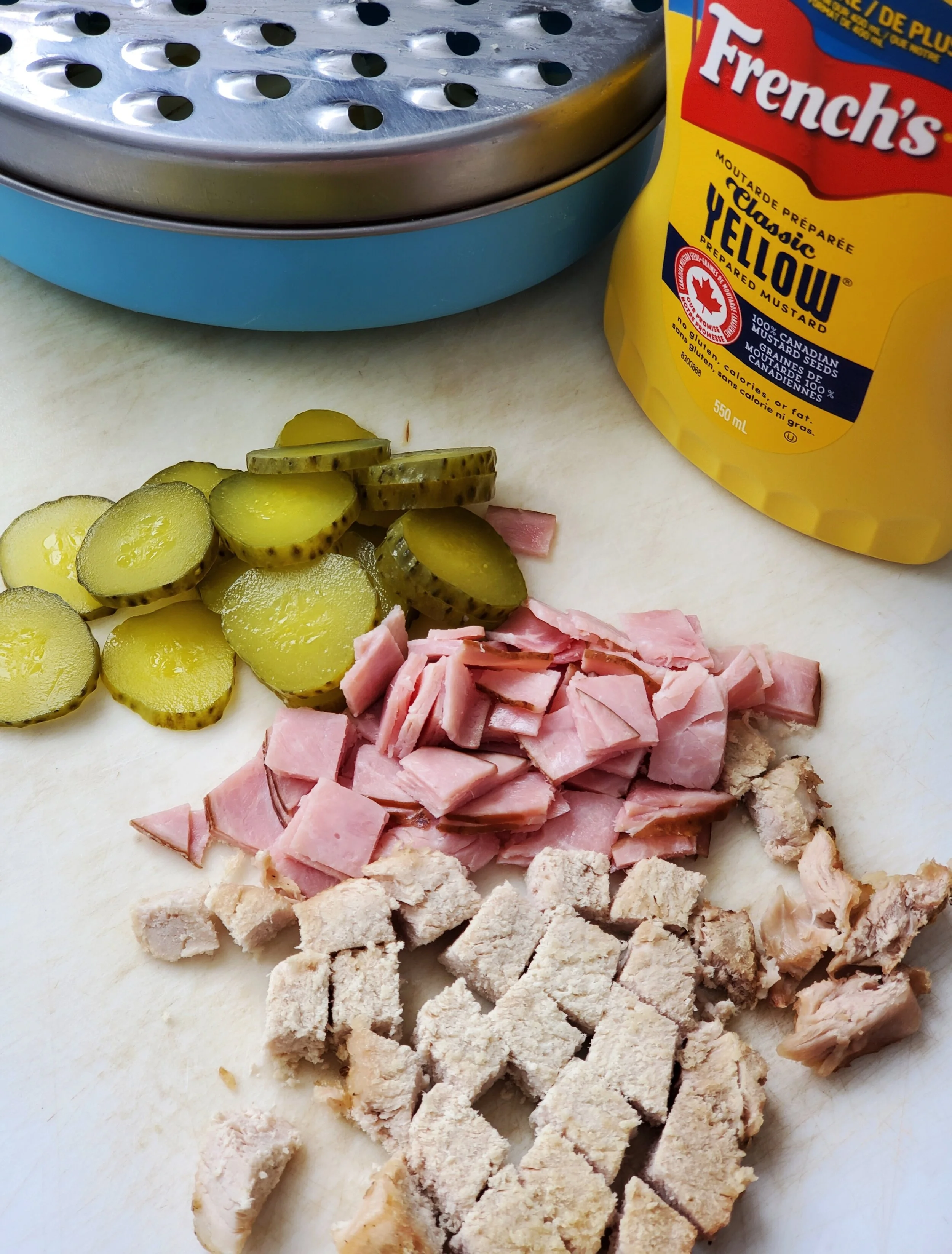 Remove the crust from the oven. Top with the diced pork and ham, the grated Swiss or Gruyères, and pickle slices.