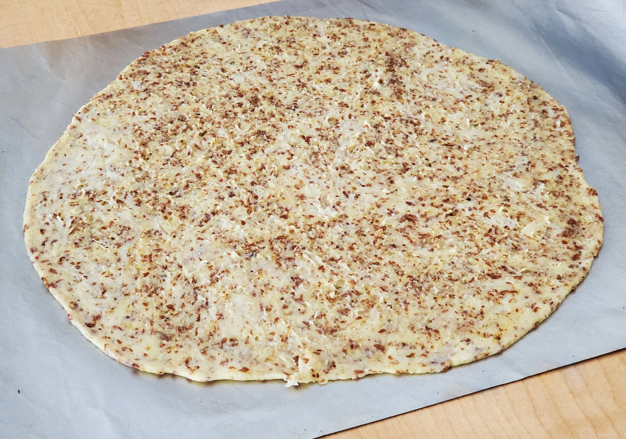 - Transfer the dough to a sheet of parchment, then cover with a second sheet of parchment and roll it out thin. Adjust to keep a round shape to the dough.