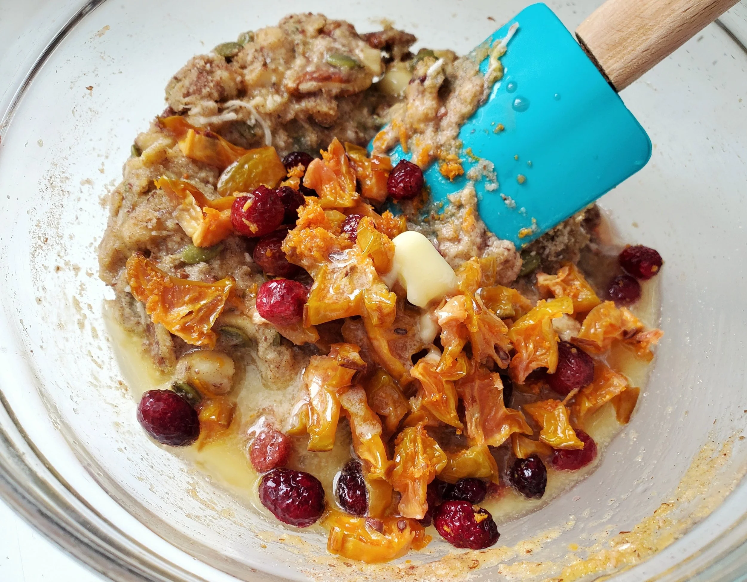 - Add the rum-soaked fruits, pecans, macadamia nuts, and pumpkin seeds, mixing until well combined.