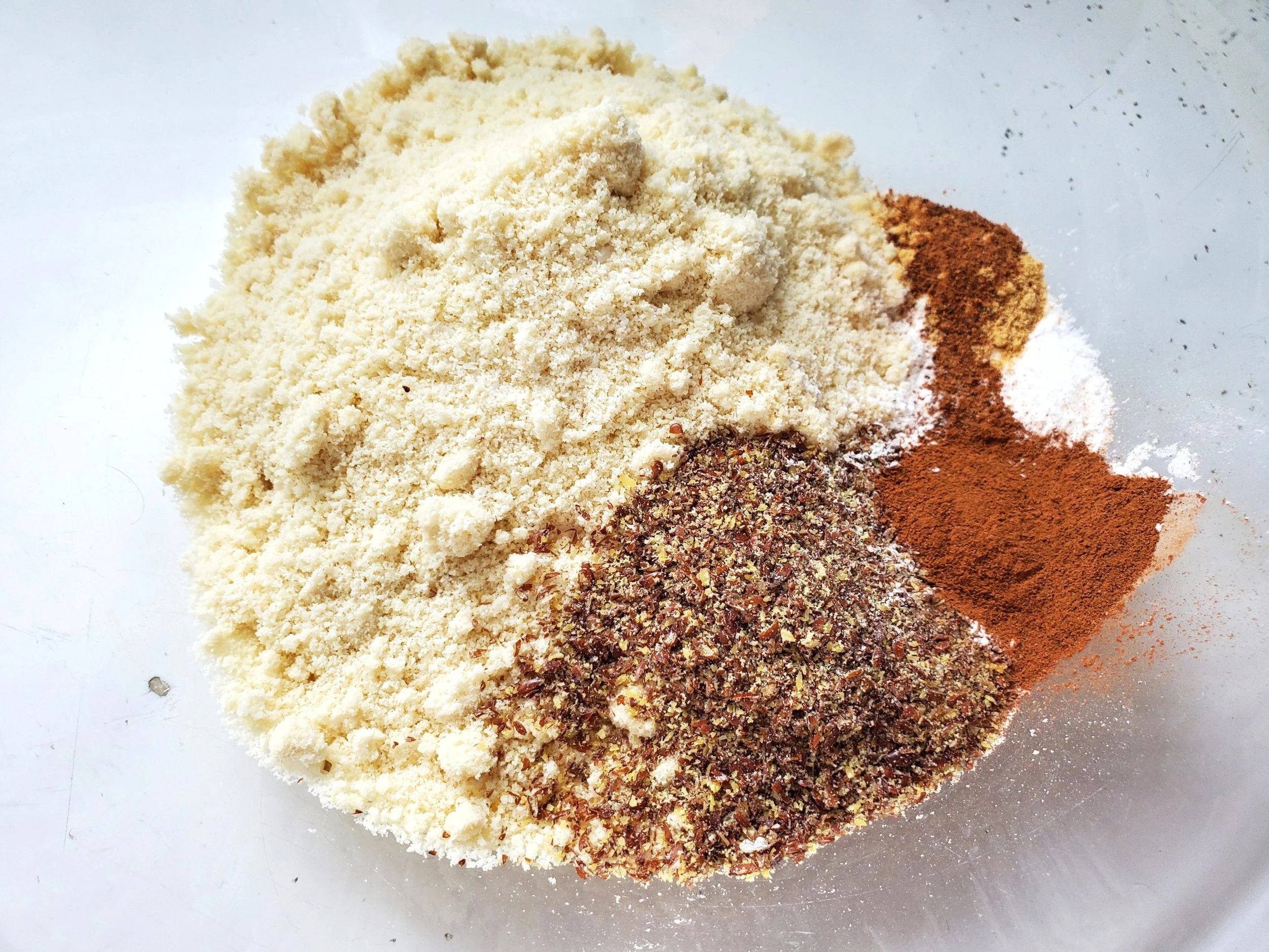 - In a large bowl, combine the almond flour, monkfruit, coconut, flaxmeal, baking powder, spices, and a pinch of salt.