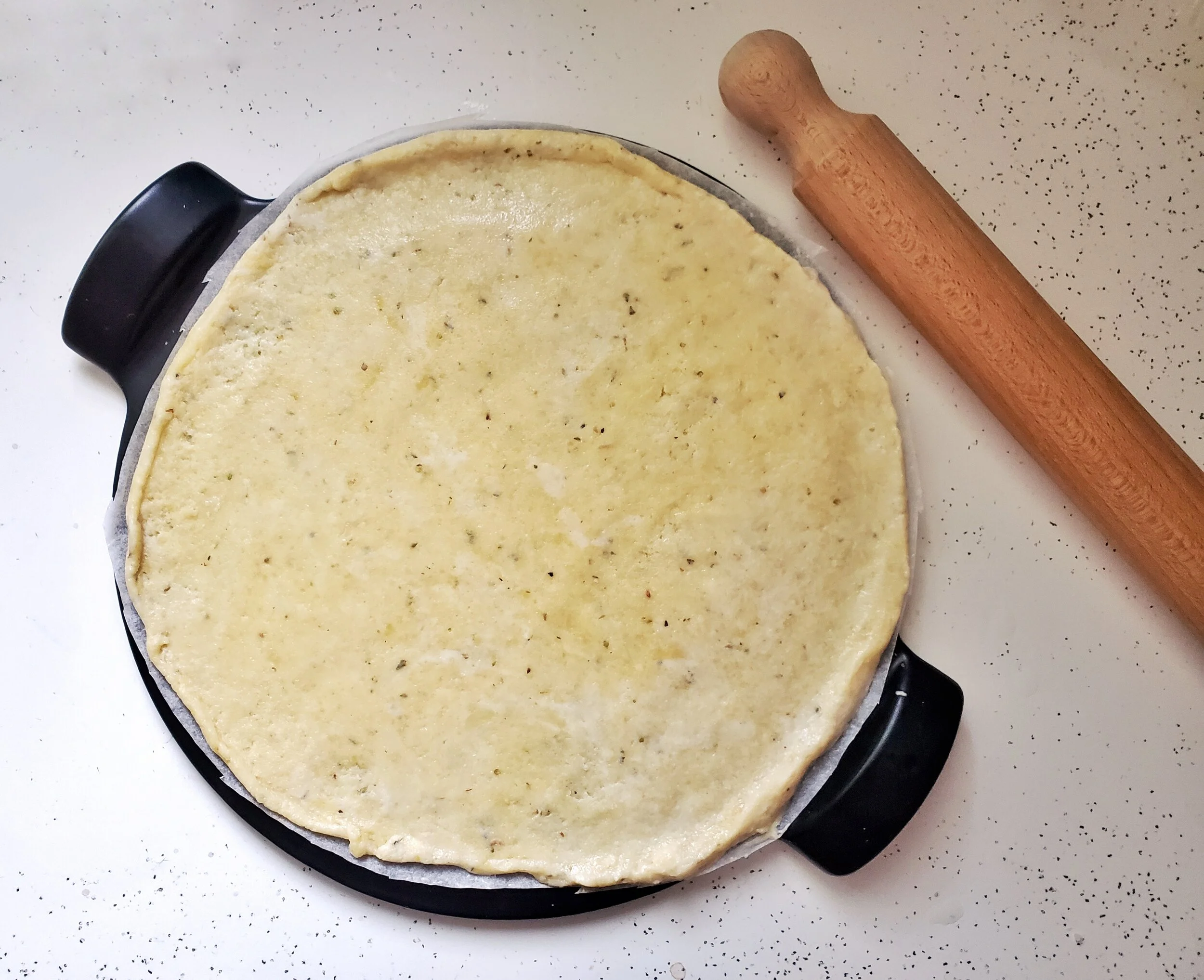 - Transfer the dough to a sheet of parchment, then cover with a second sheet of parchment and roll it out thin. Adjust to keep a round shape to the dough.