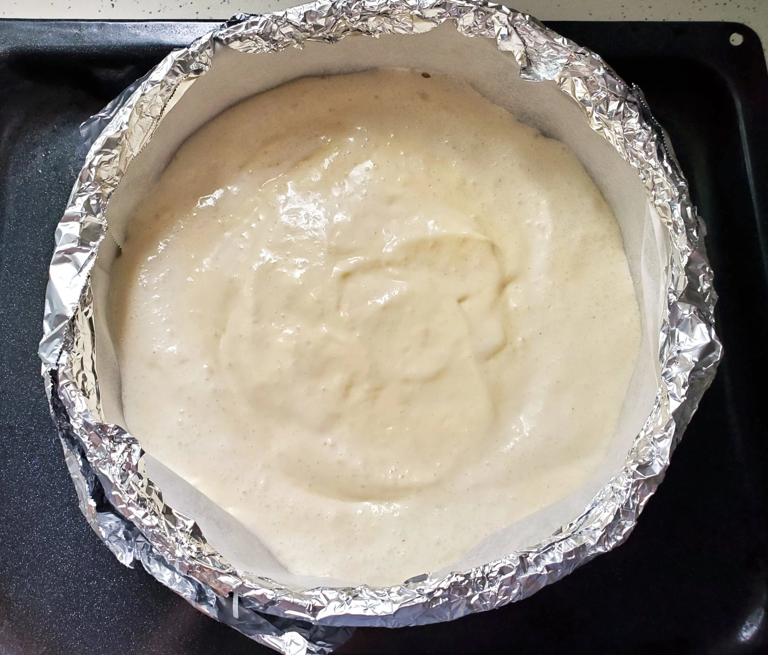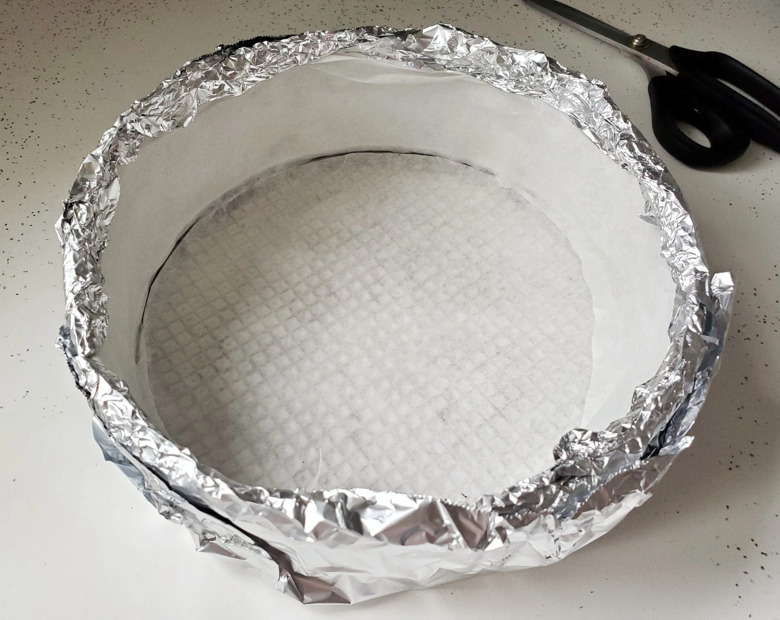 - Line the inside of a springform pan with parchment paper, then seal the outside well with aluminium. The cheesecake will be baked in a water bath, so this will prevent the water from getting in.