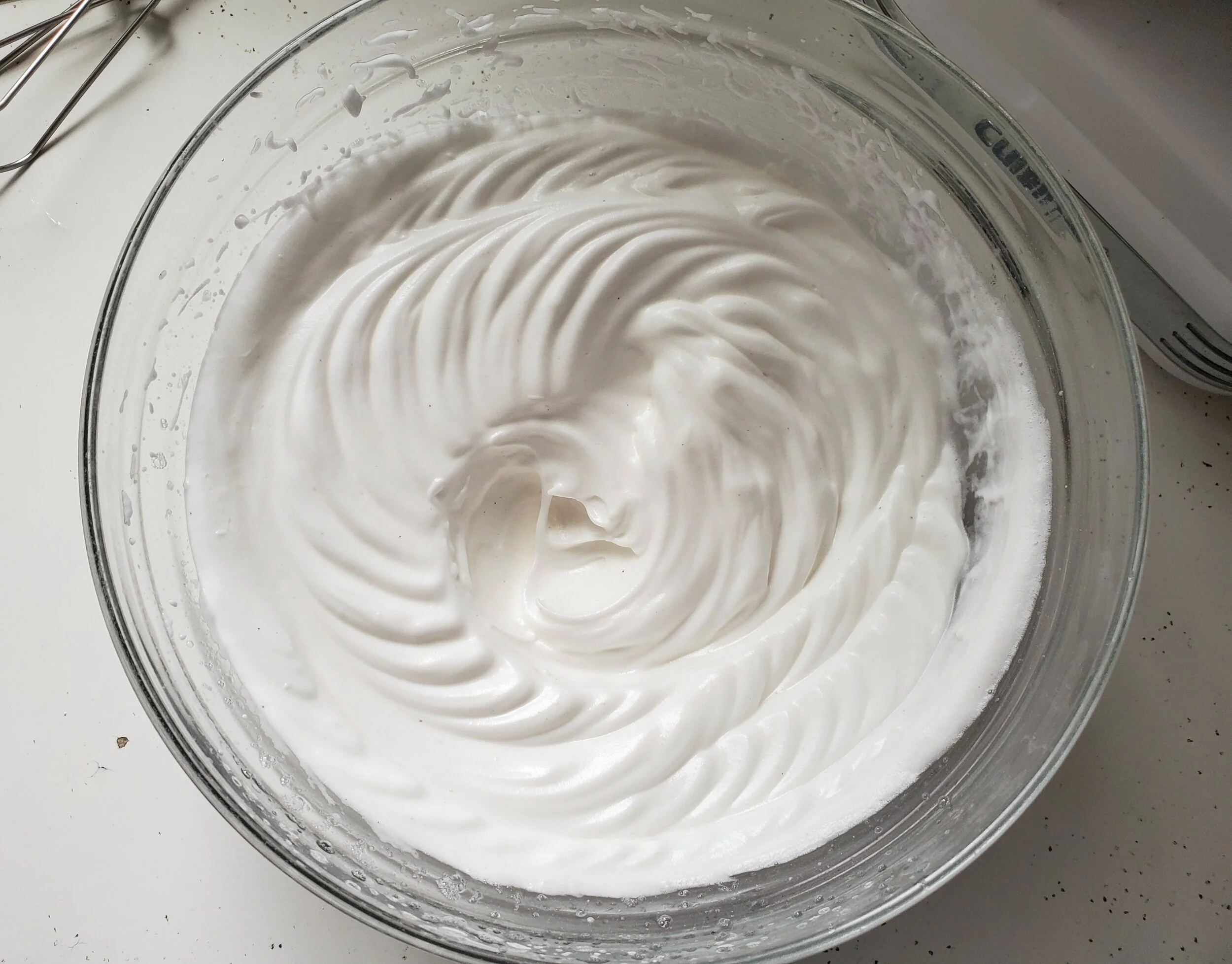 - Slowly add the powdered sweetener, then continue whisking until the meringue forms stiff peaks. Set aside.
