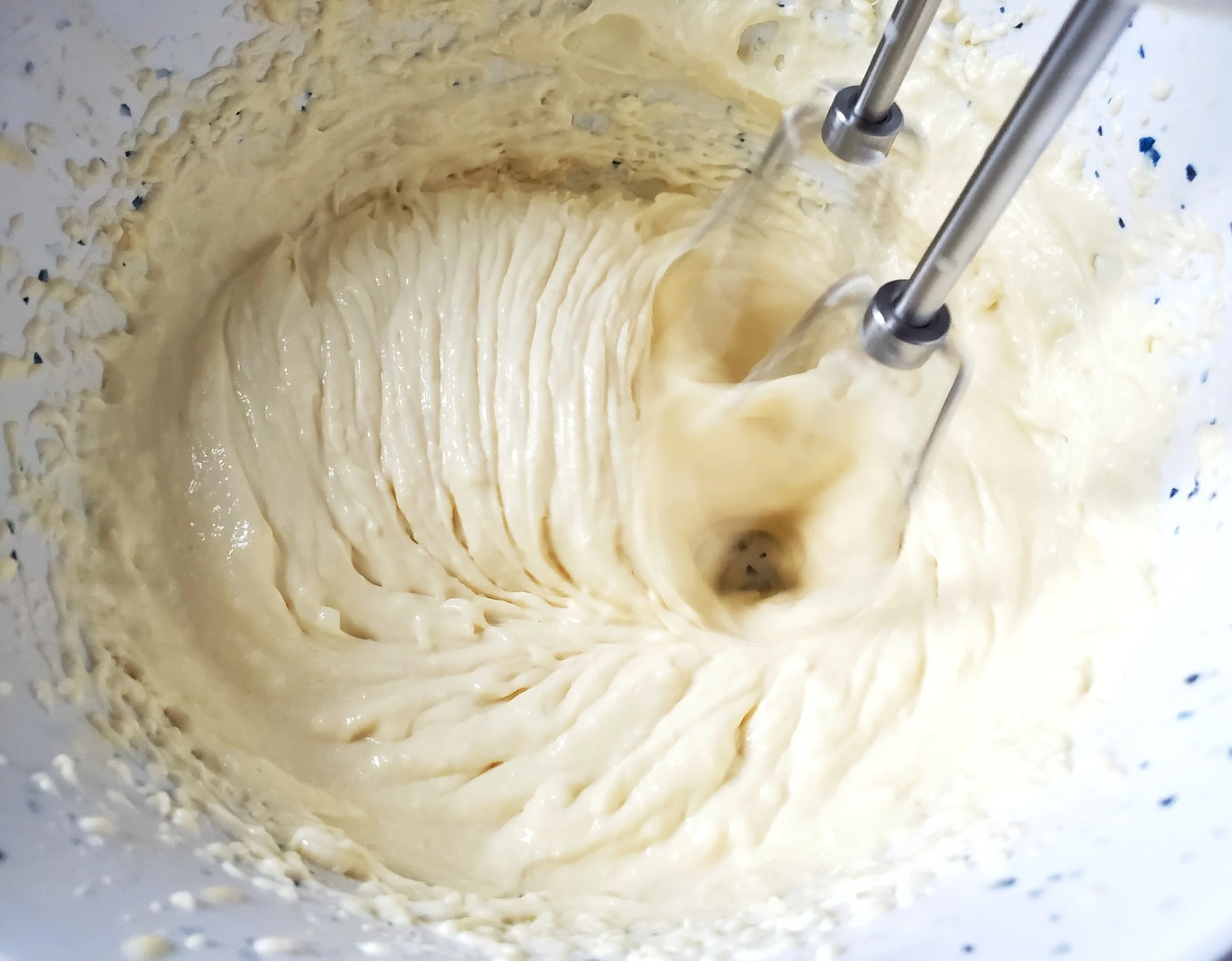 - Next, we work with the large bowl containing the egg yolks. Add the cream cheese and whisk well, using a handmixer.