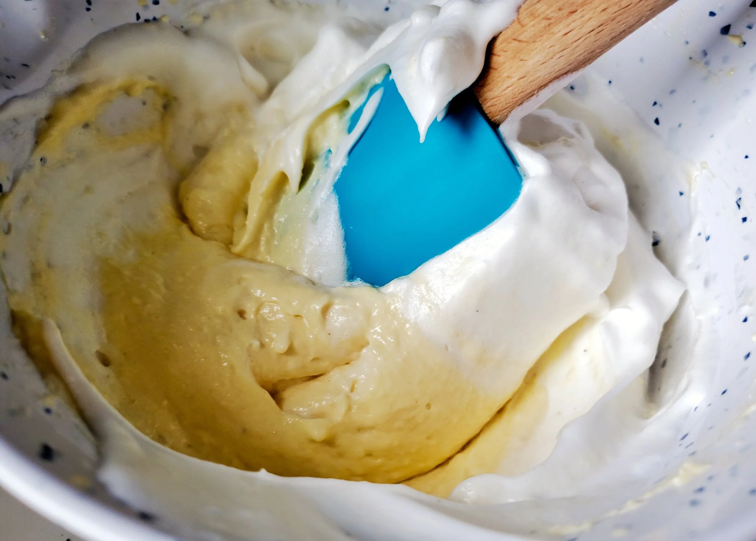- Once well combined, set aside the handmixer. Using a scraper spatula, gently fold in a quarter of the egg meringue.
