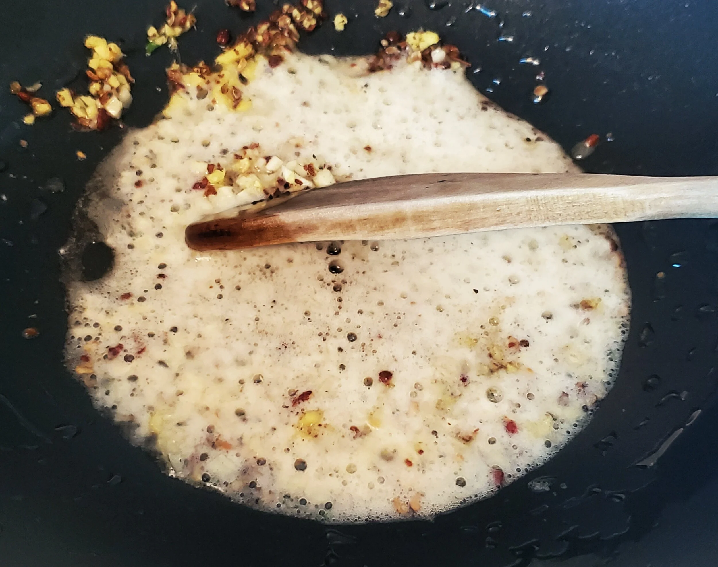 - Add the garlic, ginger and Szechuan peppercorns to the wok or skillet, and sautee 2 min to release the fragrances.