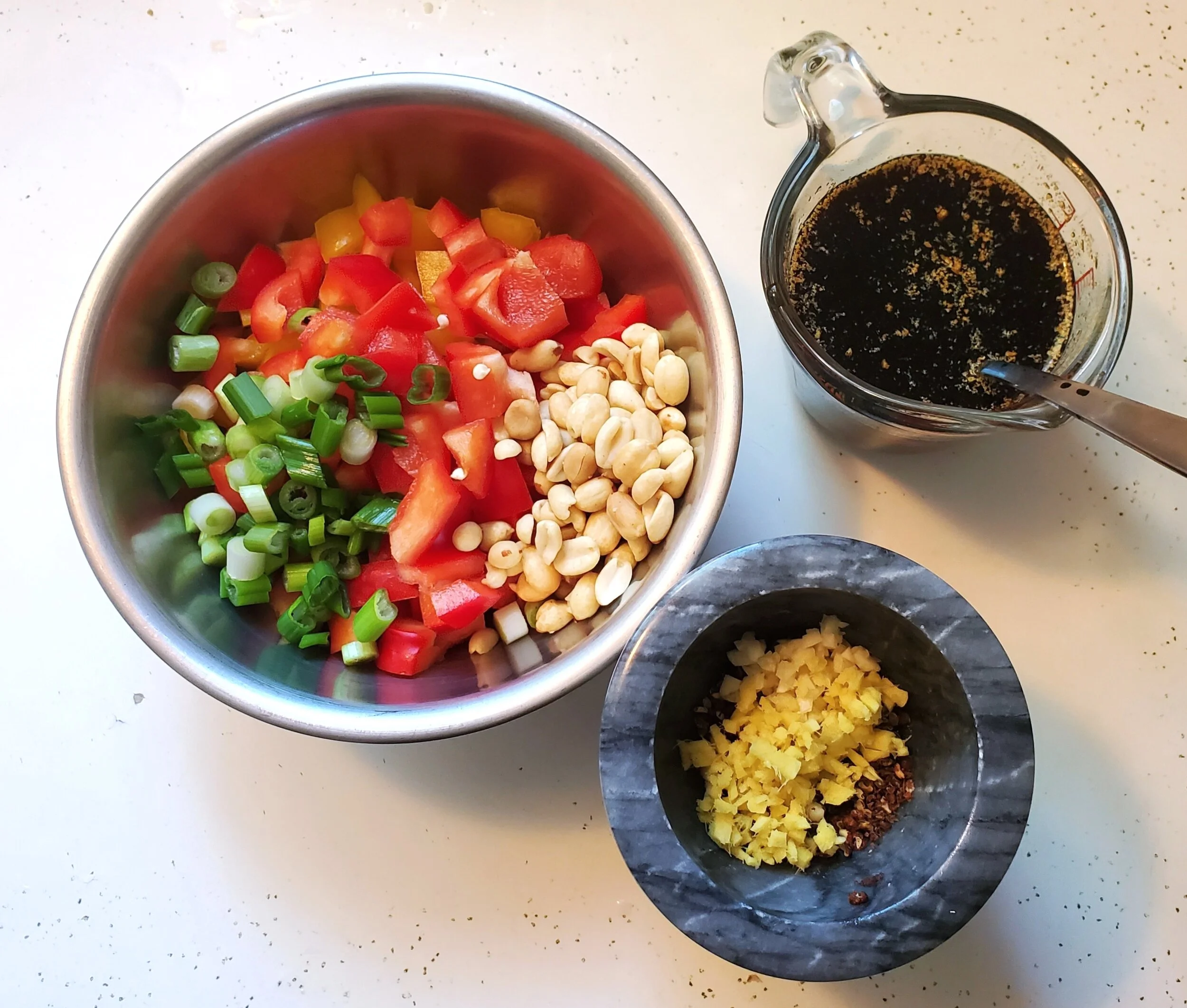While the chicken marinates, prepare the kung pao sauce and other ingredients.