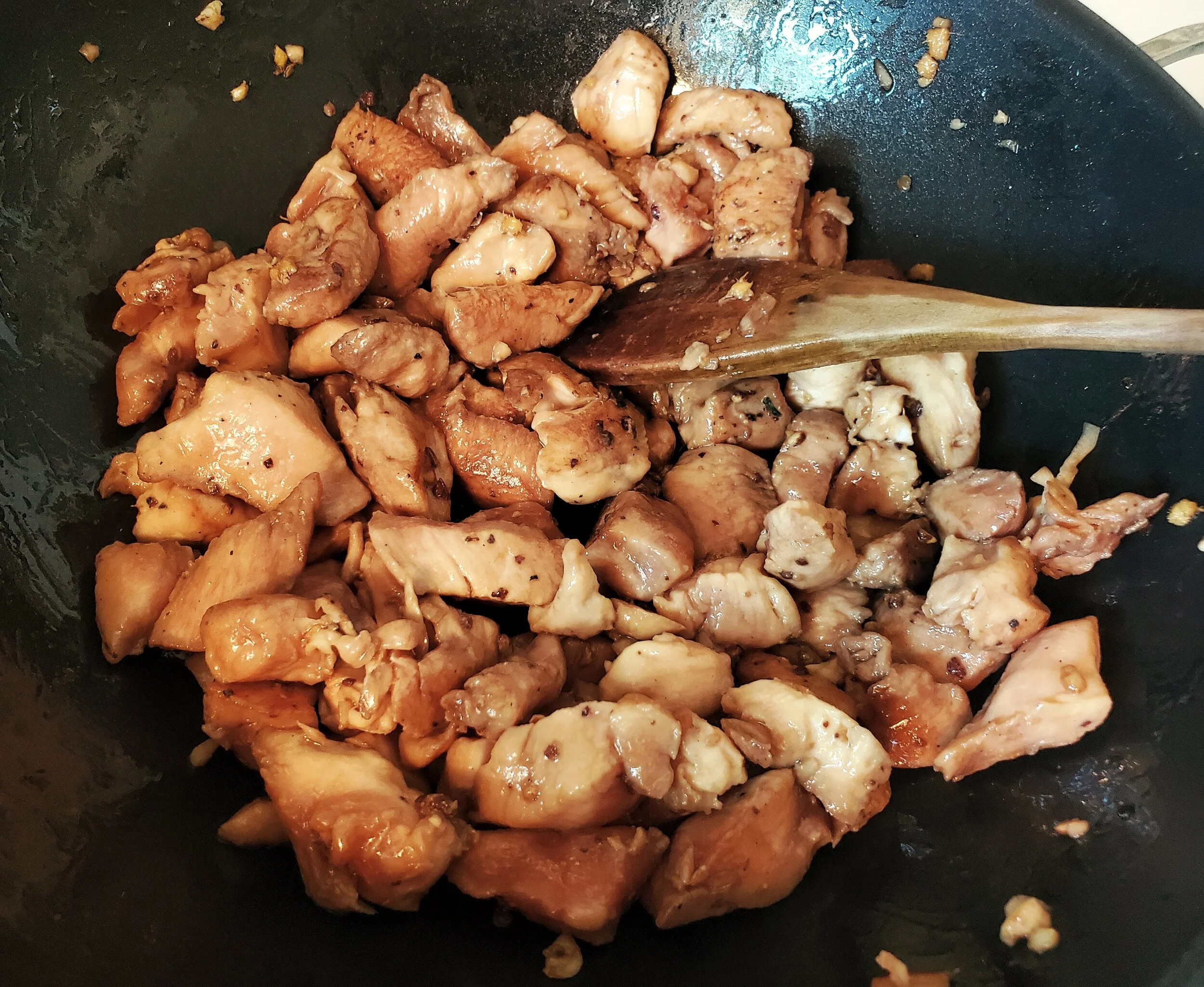 - Toss the diced chicken breast with the marinade ingredients, cover and refrigerate 30 min.