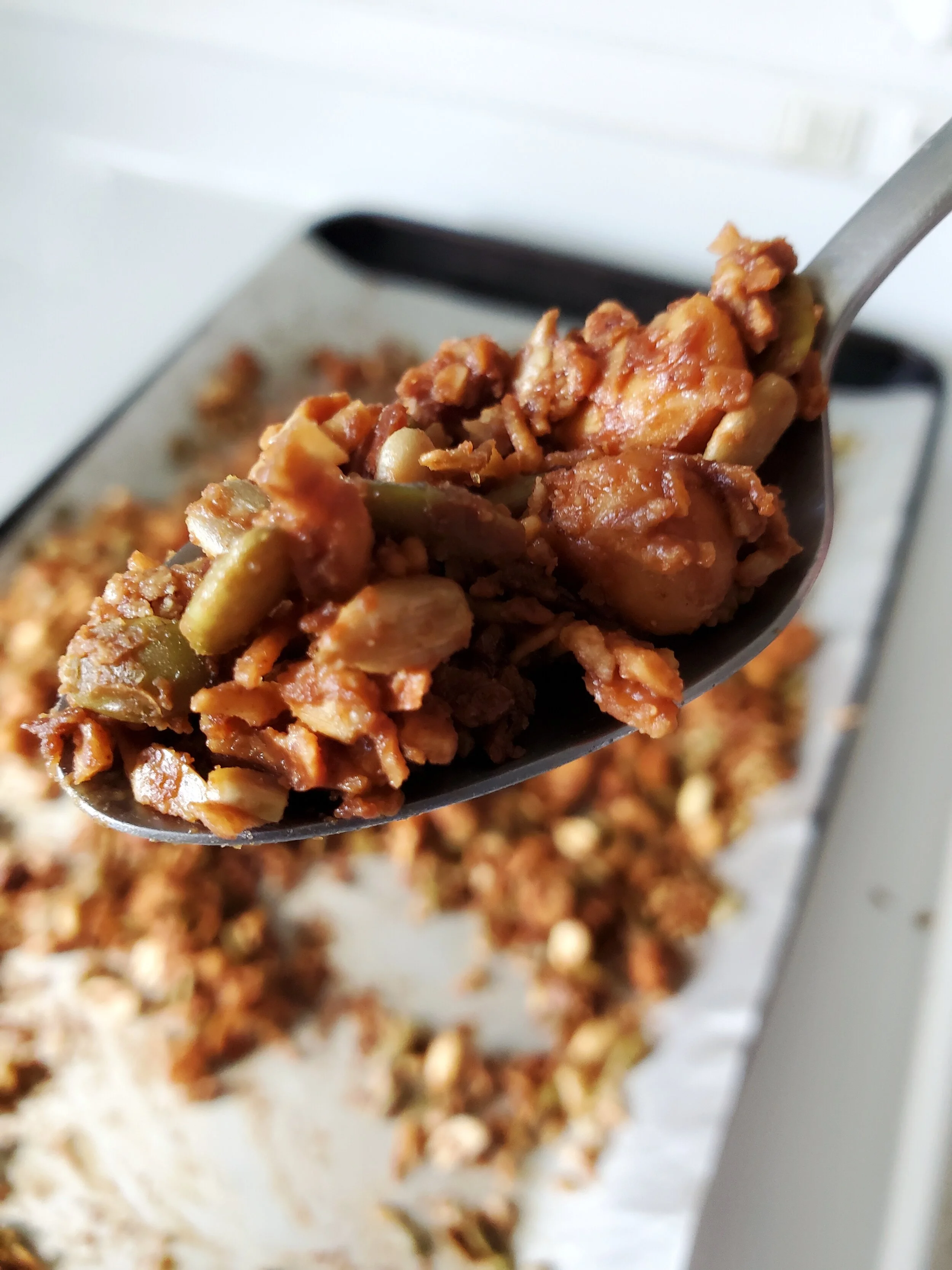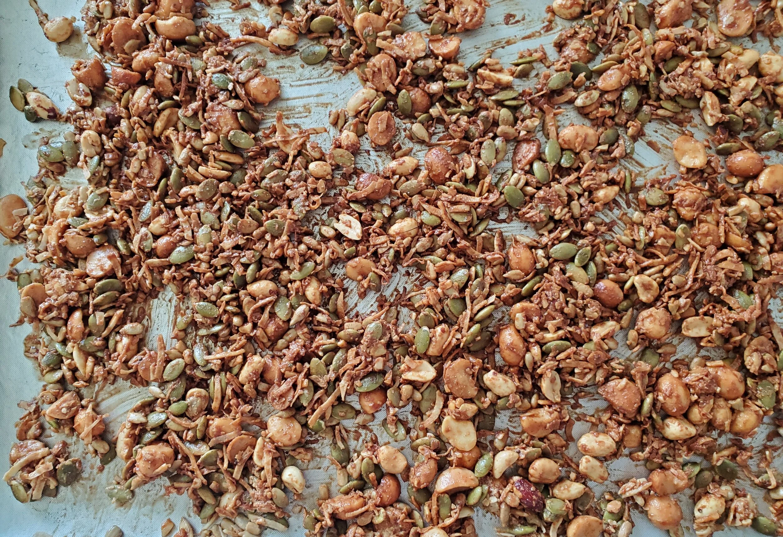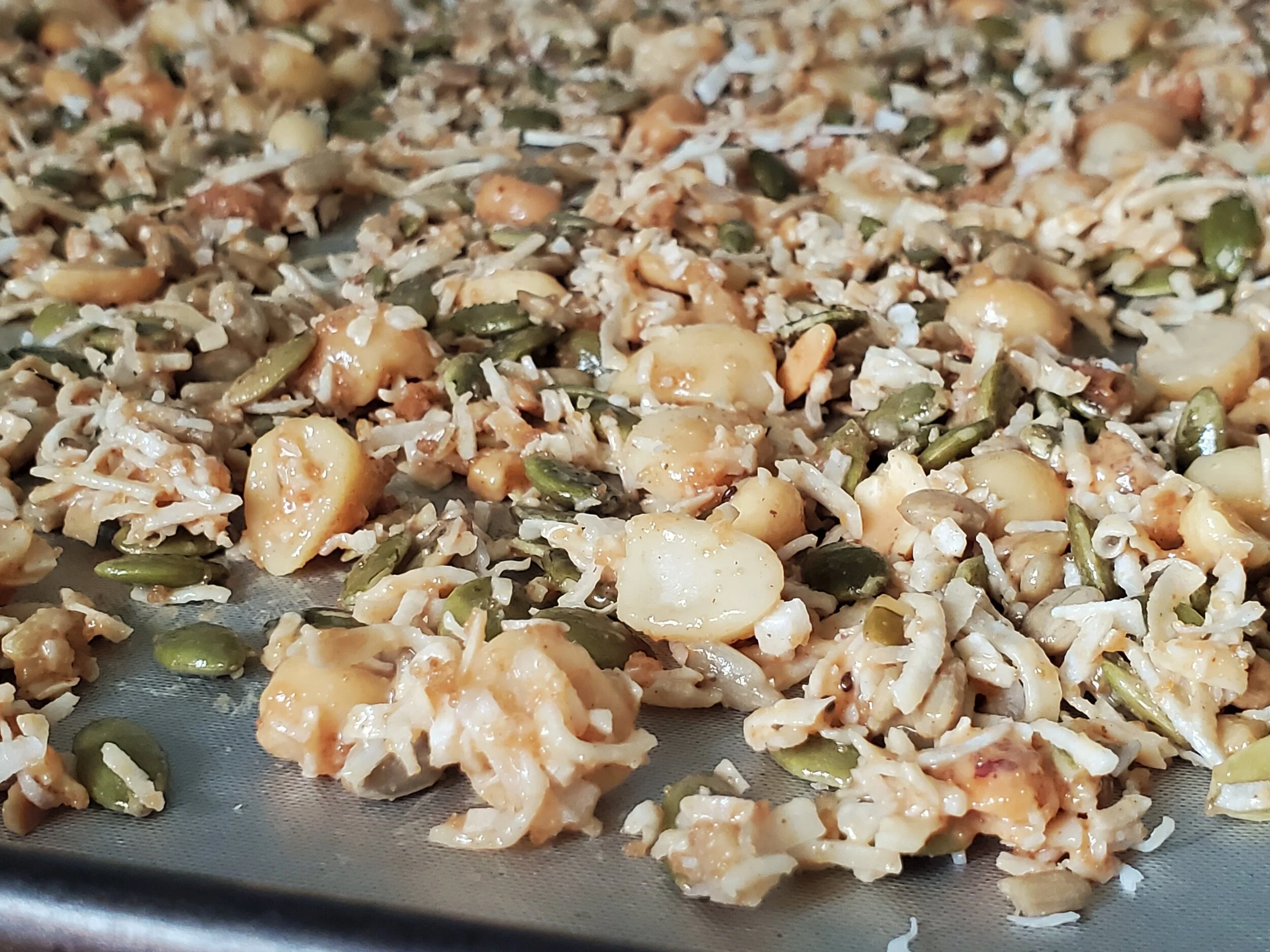 Pull the baking sheet out of the oven, and give the nut cereal a good stir. Spread it out again and return to the oven for another 15-20 min, until the nuts are golden.