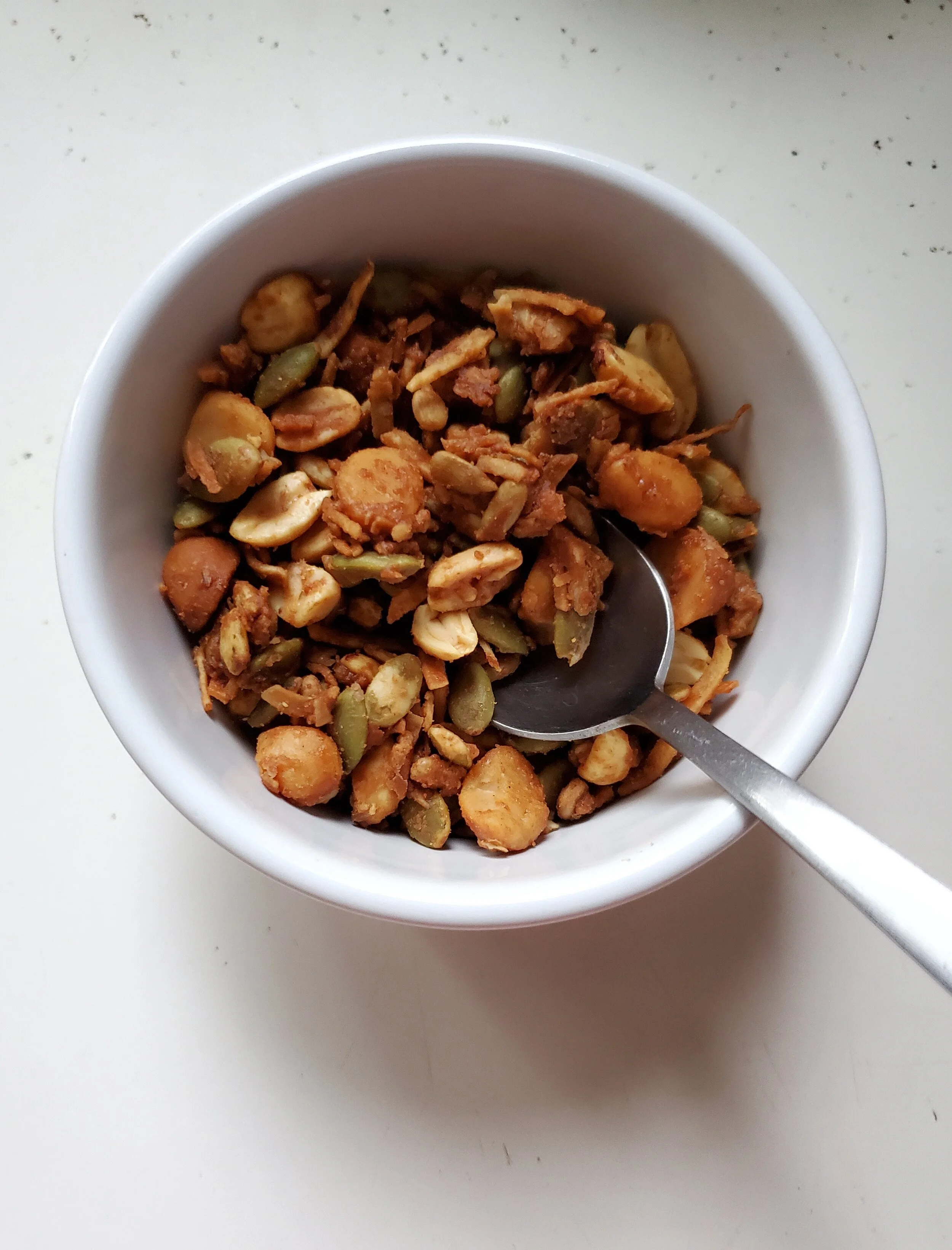 Place all the ingredients into a large bowl and stir well. I like to mix by hand, even though it gets messy, to spread the coconut oil and peanut butter evenly.