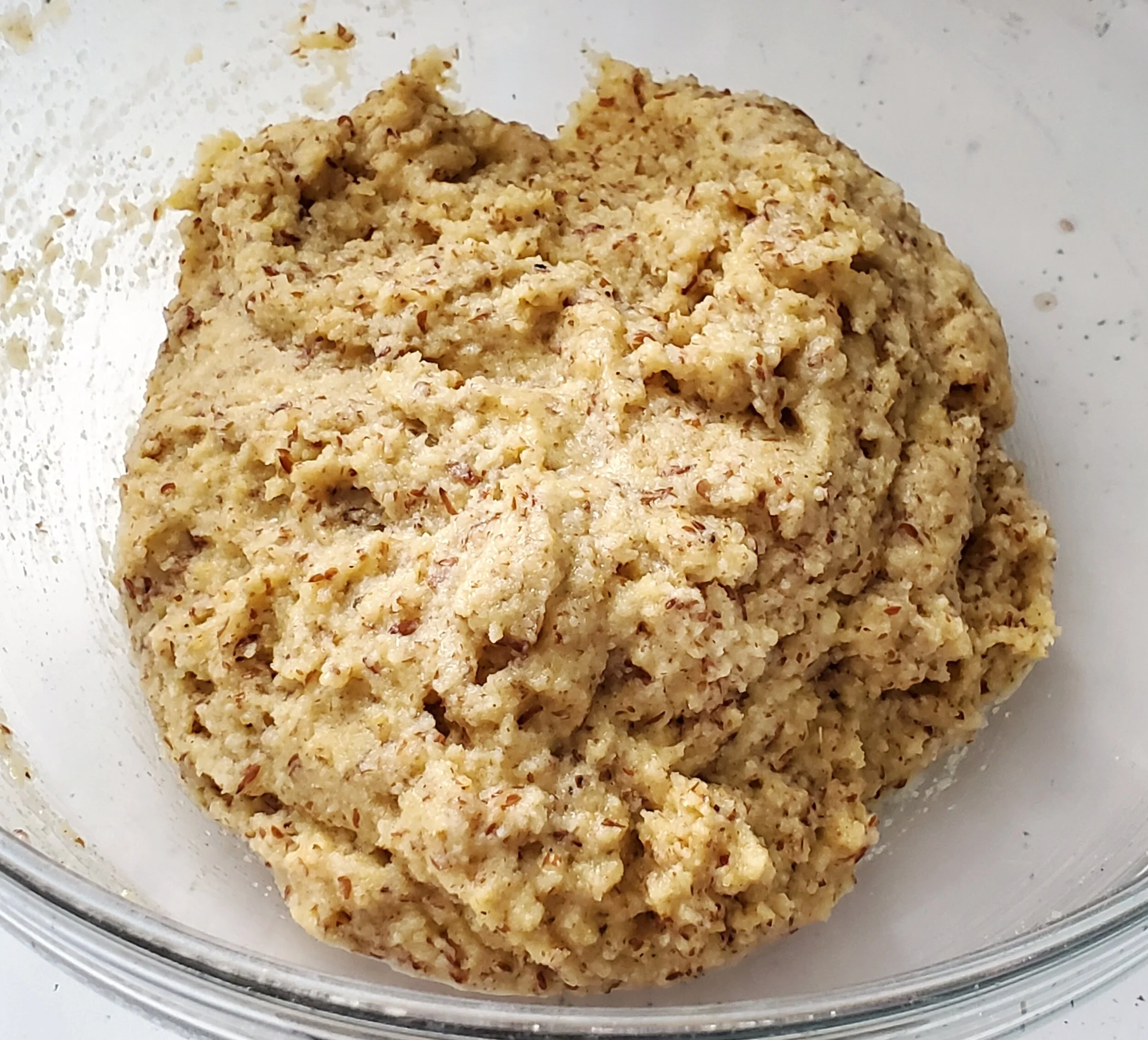 - In a large bowl, mix together the almond flour, psyllium husk powder, flaxmeal, baking soda and salt. Set the dry ingredients aside.