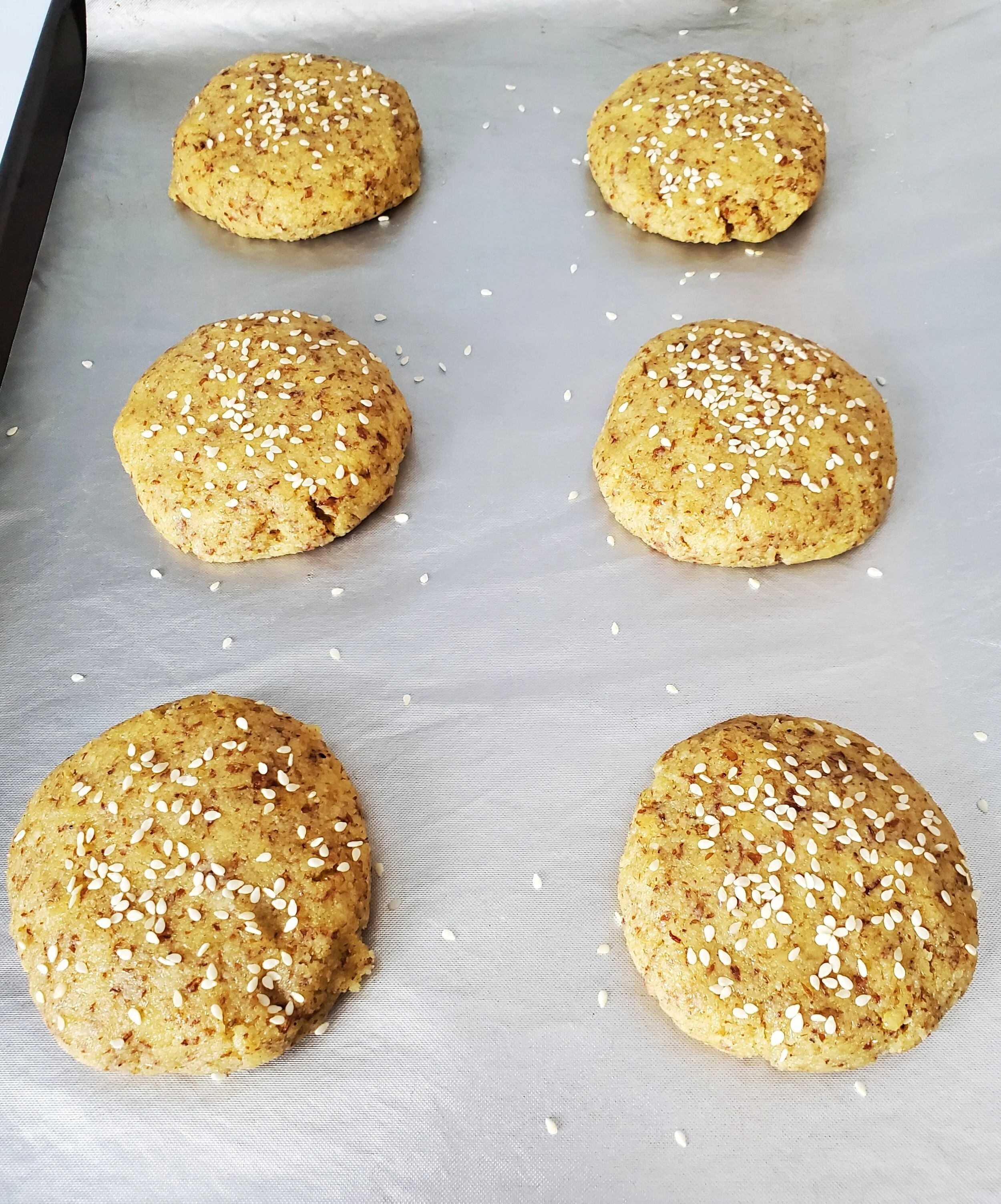 - Shape the dough into 6 balls and place then spaced out on a parchment lined baking seed. Sprinkle the buns with the seame seeds, then flatten slightly.