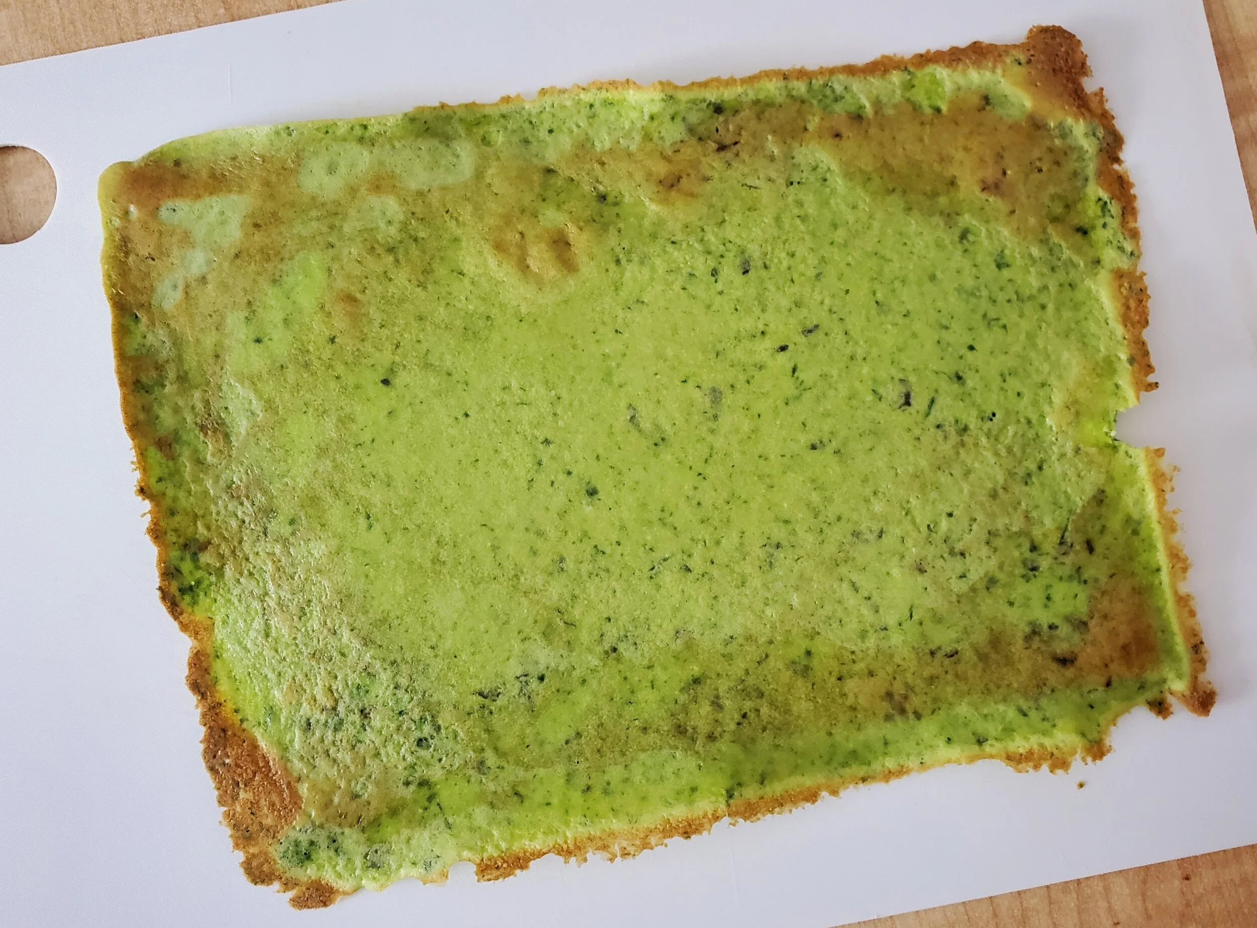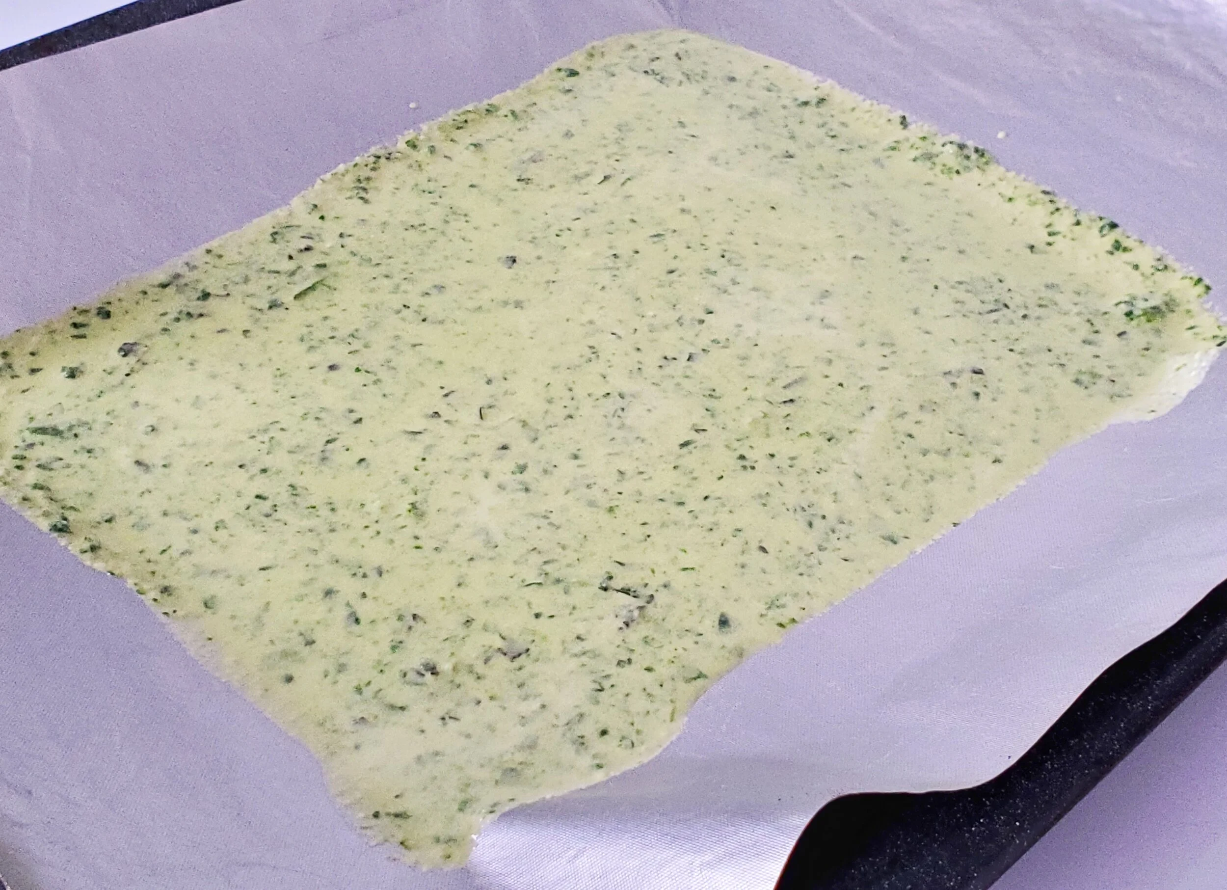 Pour the egg noodle mixture into the parchment lined sheet and spread it out thin.