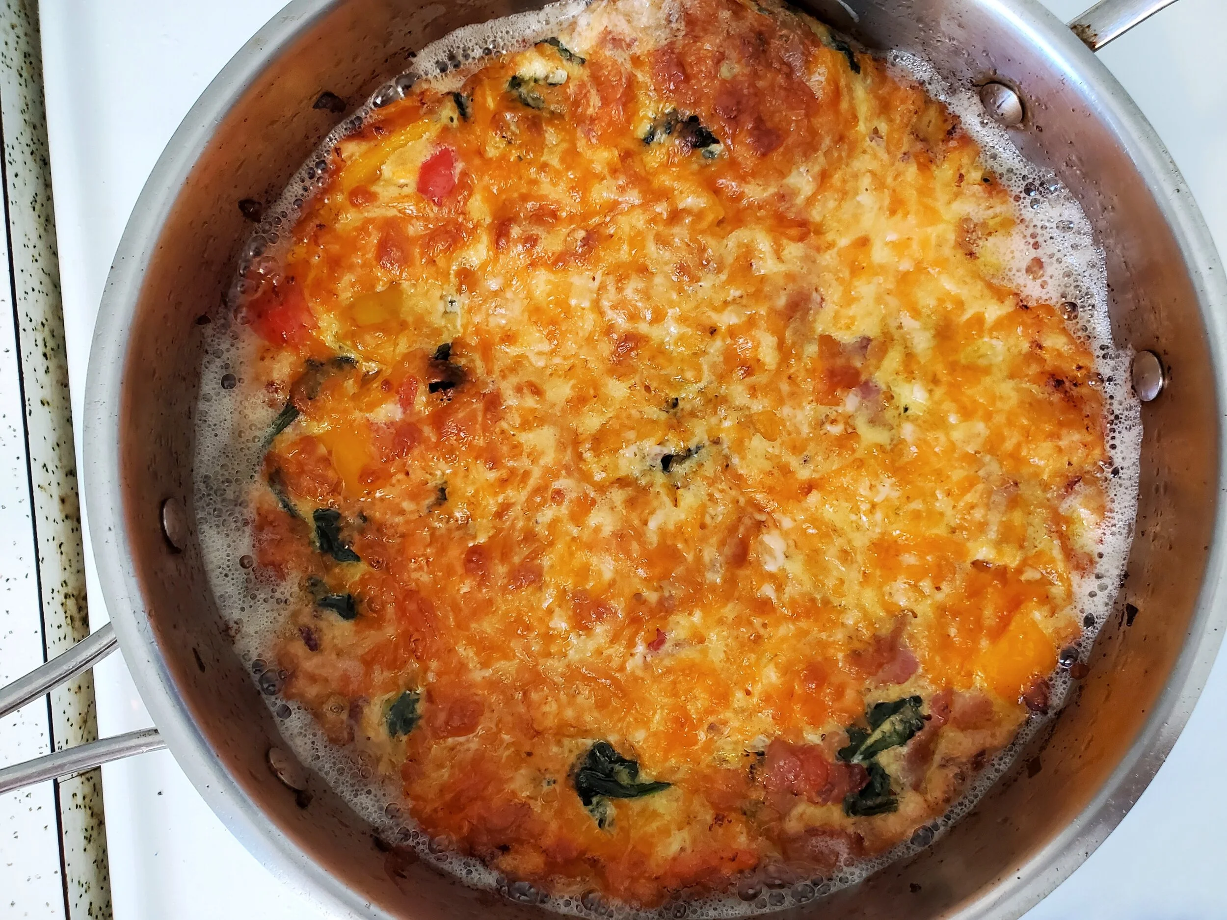 - Sprinkle the grated cheddar evenly over the top of the omelette and transfer the skillet to the oven.