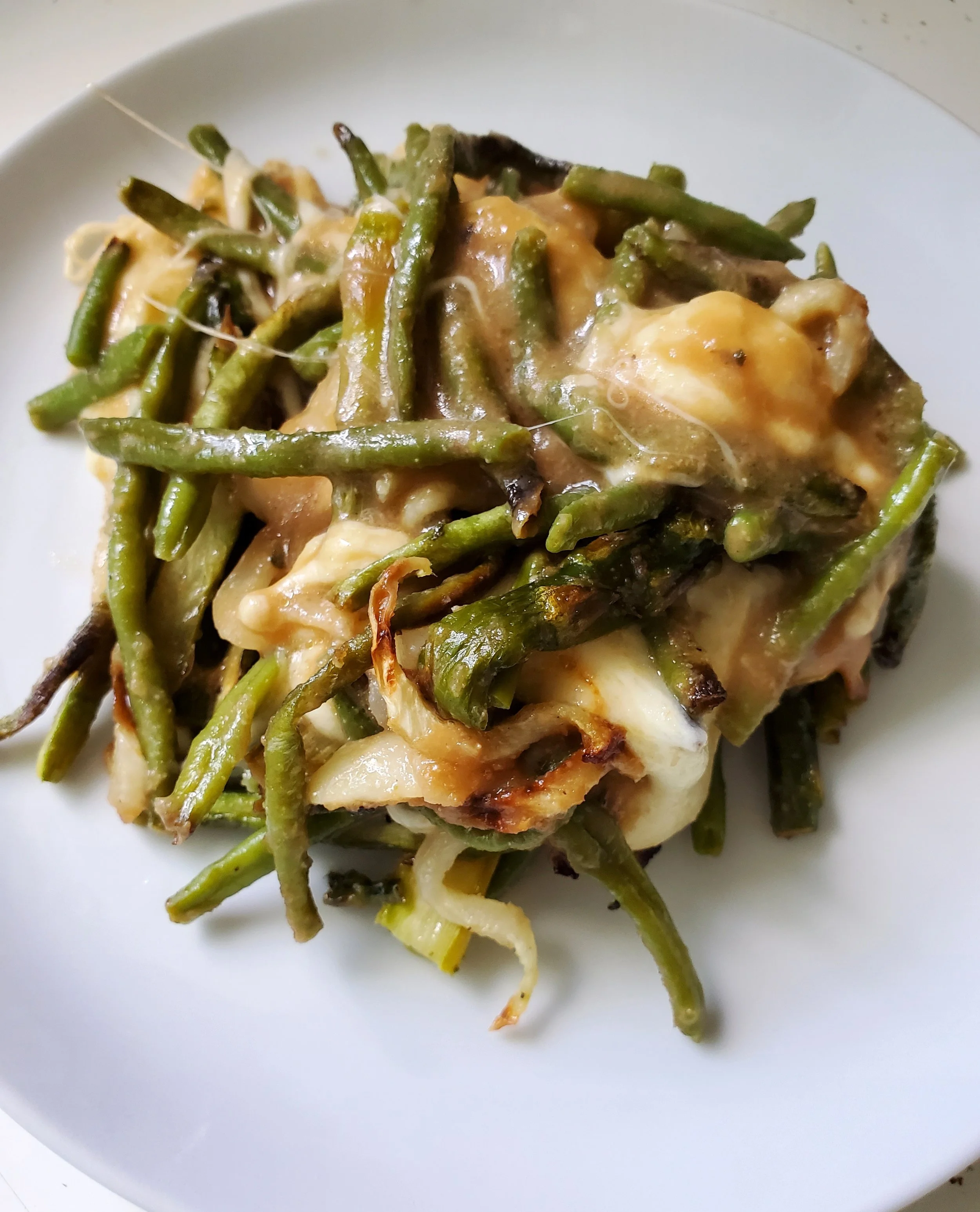 Place the baking dish into the oven on broil for 3-5 min, to melt the cheese curds slightly.