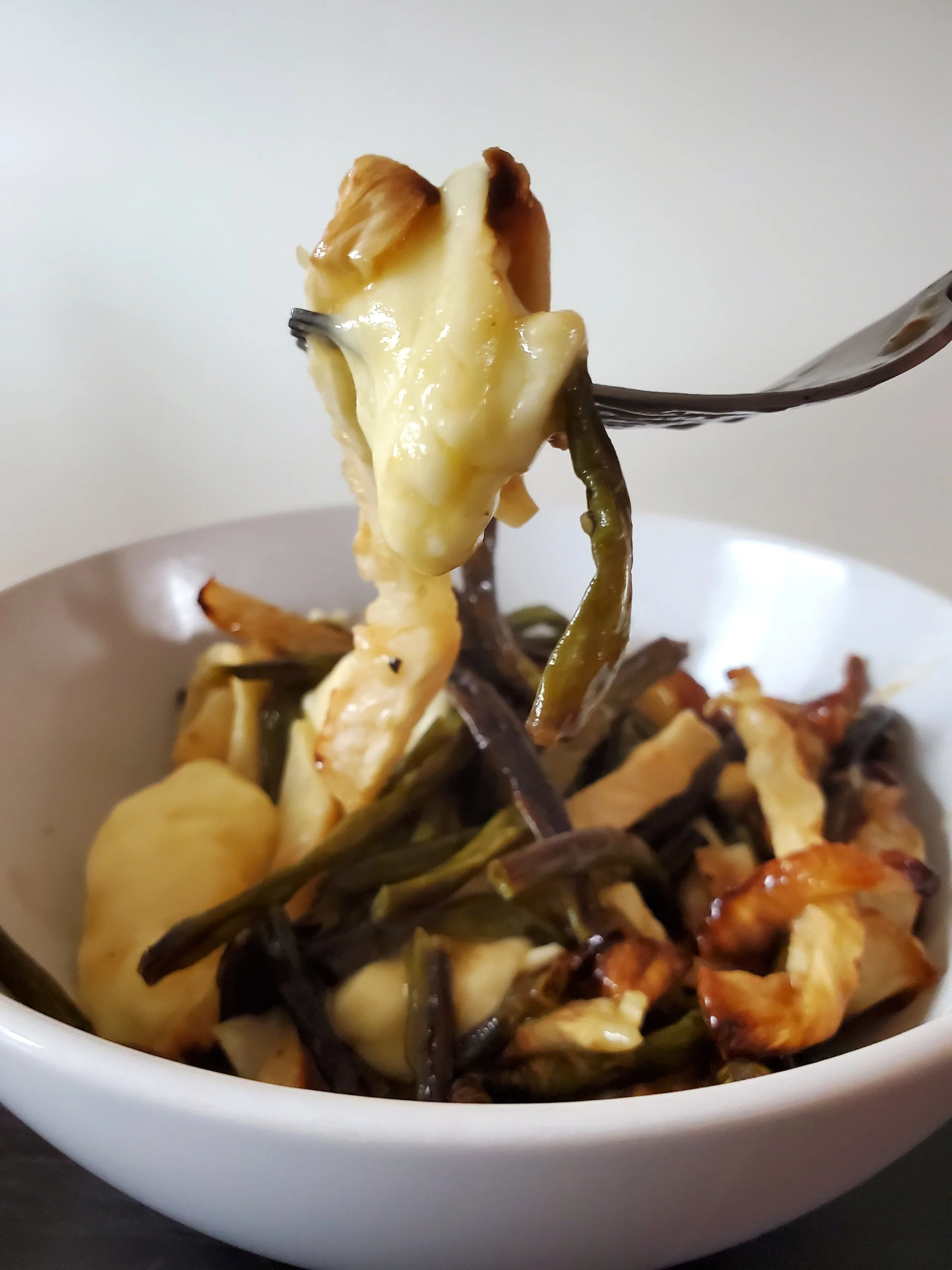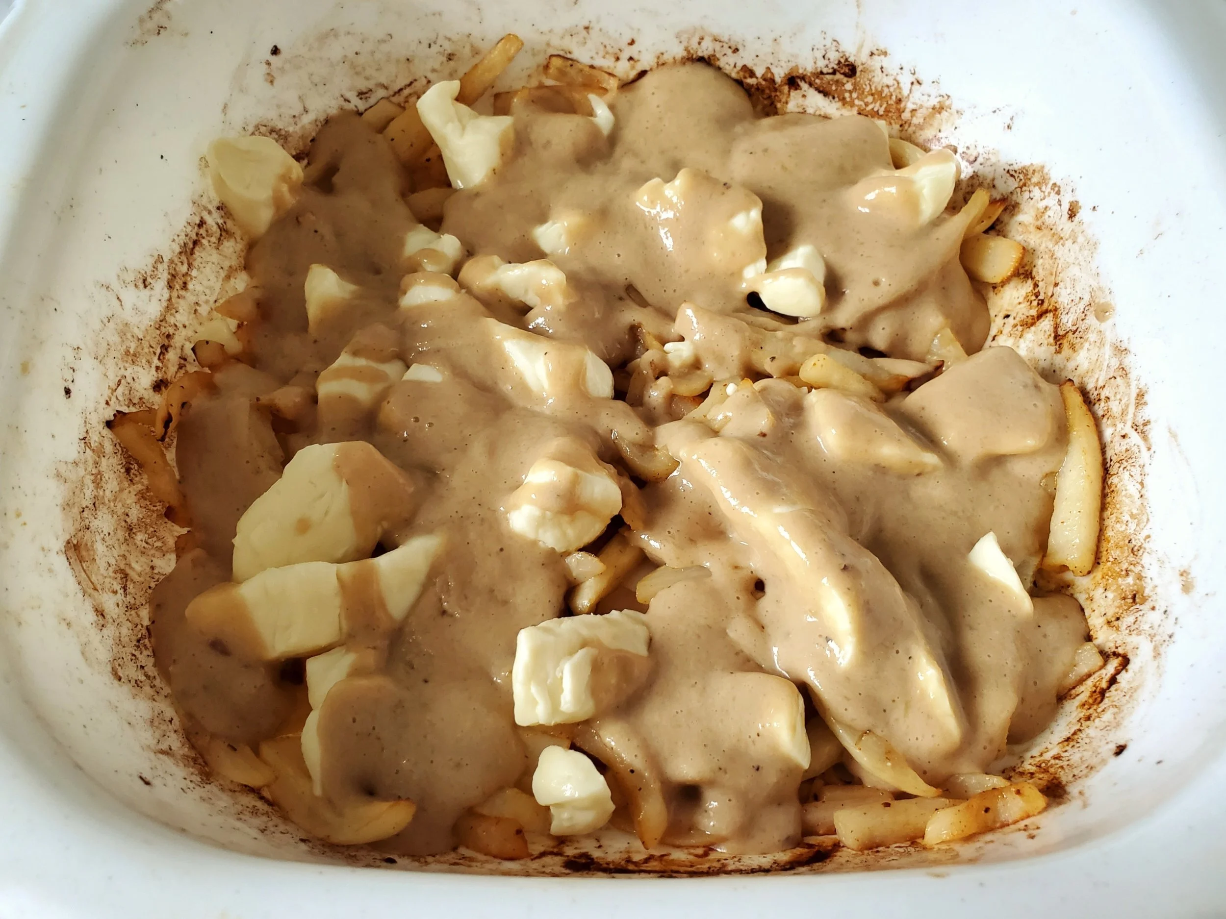 Once turnip fries are ready, toss with the cheese curds in a small baking dish, then drizzle with the poutine sauce.