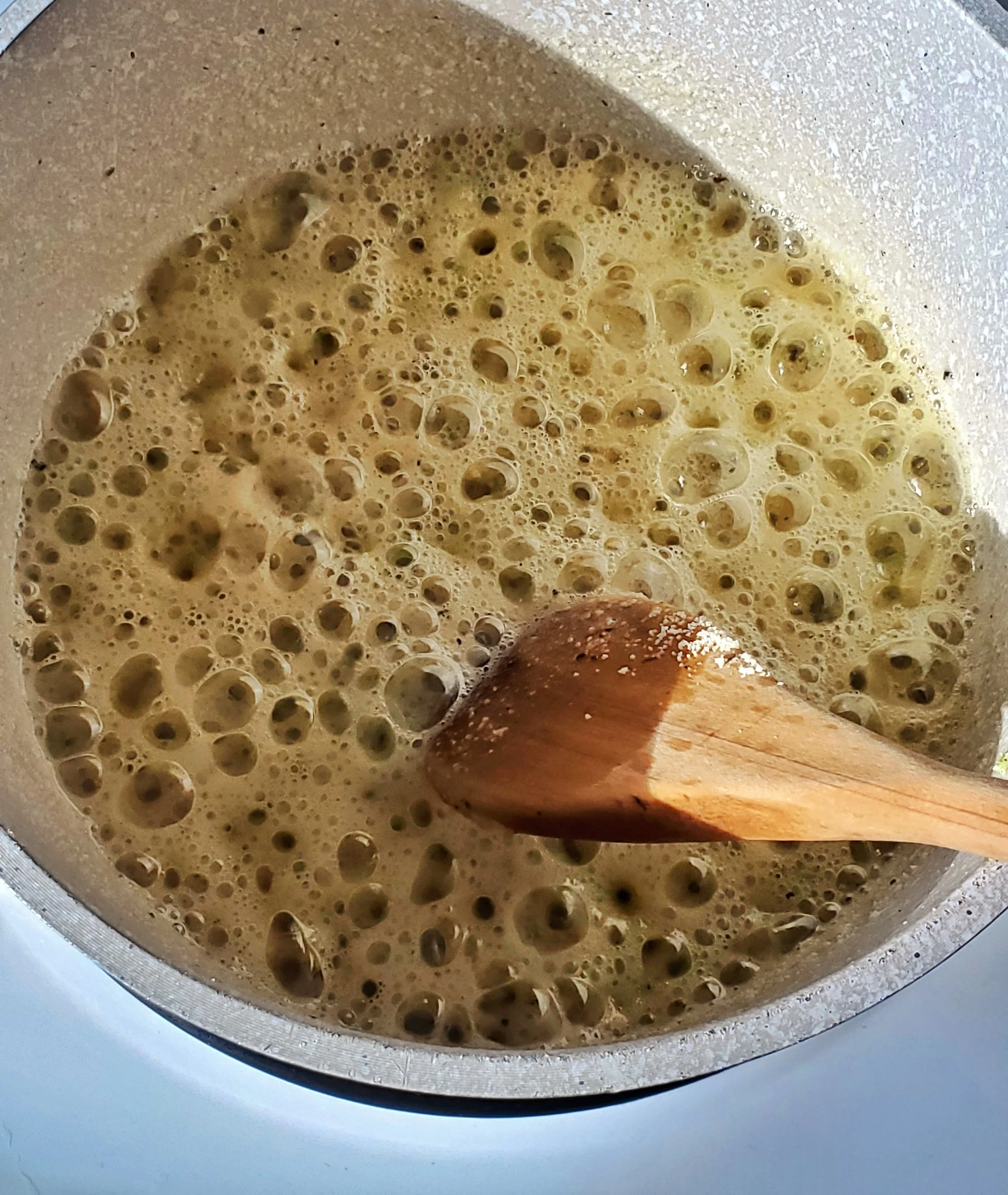 - Remove from heat, add xanthan gum and pulse until smooth using an immersion blender. You can also transfer to a blender to pulse.