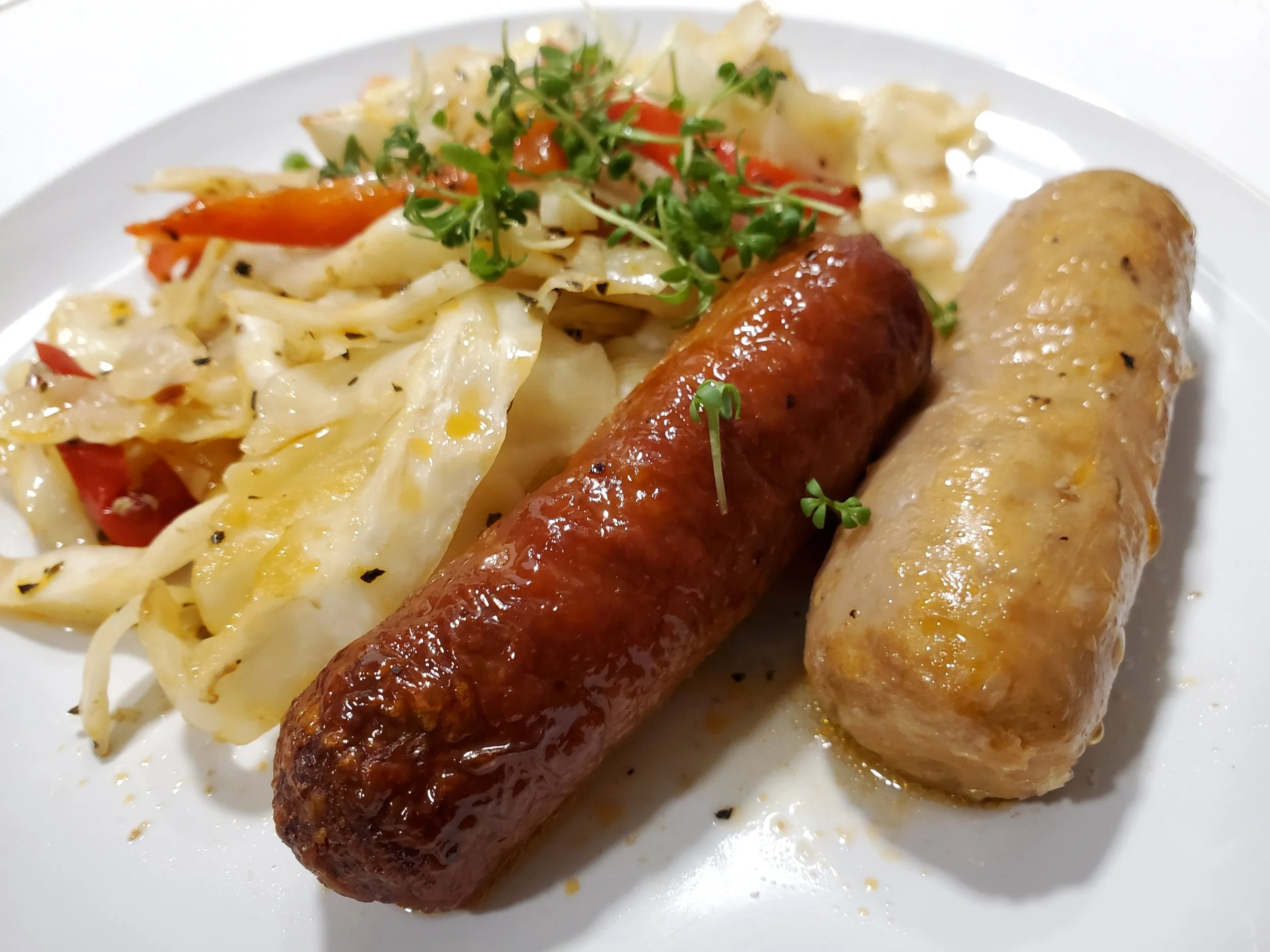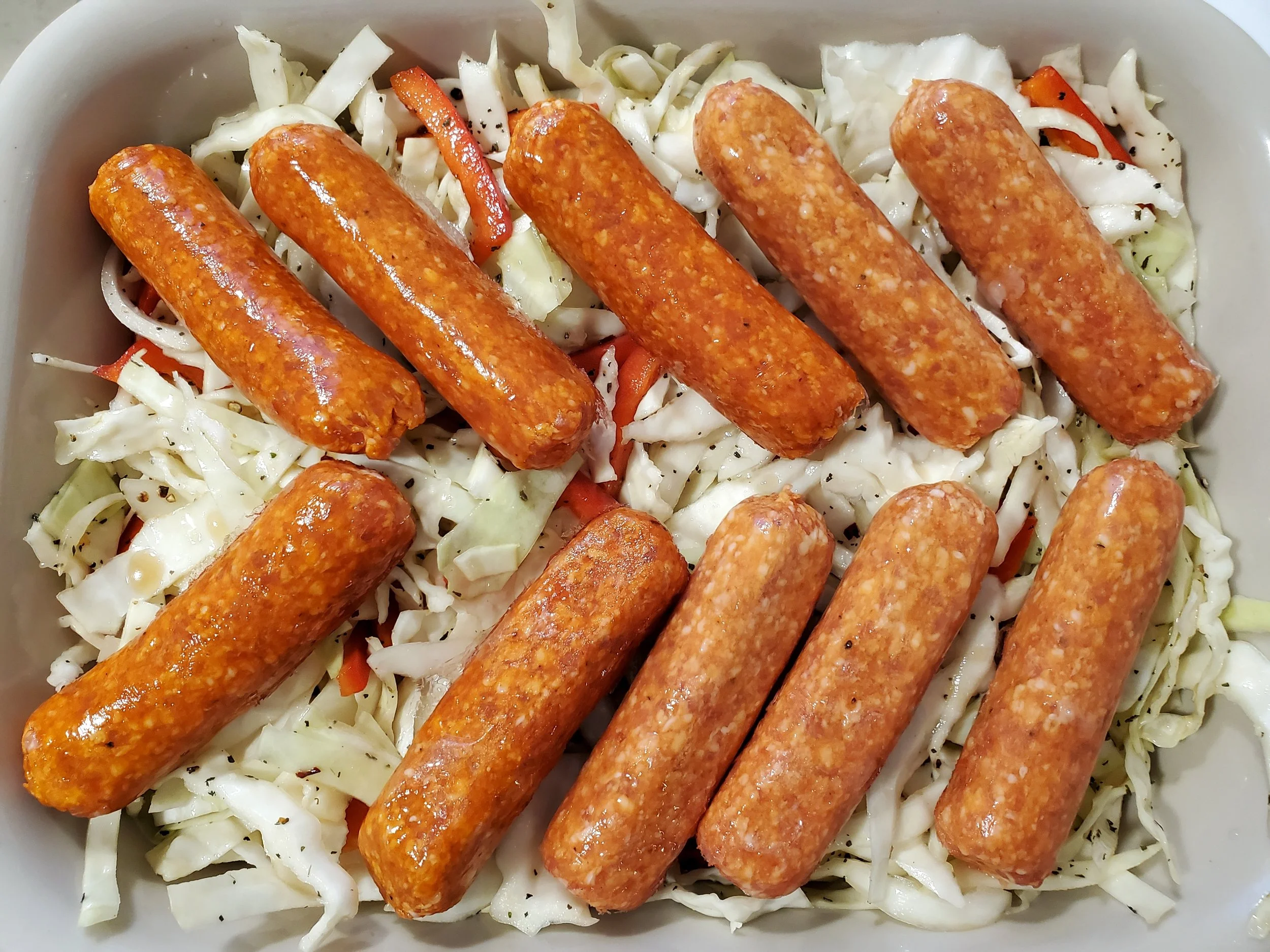 - Lay the Italian sausages over the cabbage, then drizzle with the beef broth.