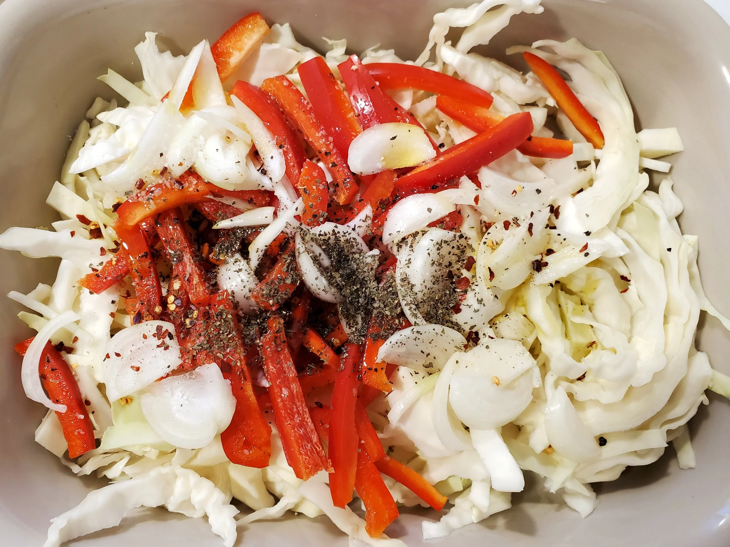 - In a large bowl, toss together the shredded cabbage, bell pepper, onion, olive oil, basil, chili flakes, garlic powder, and season to taste with salt and pepper.
