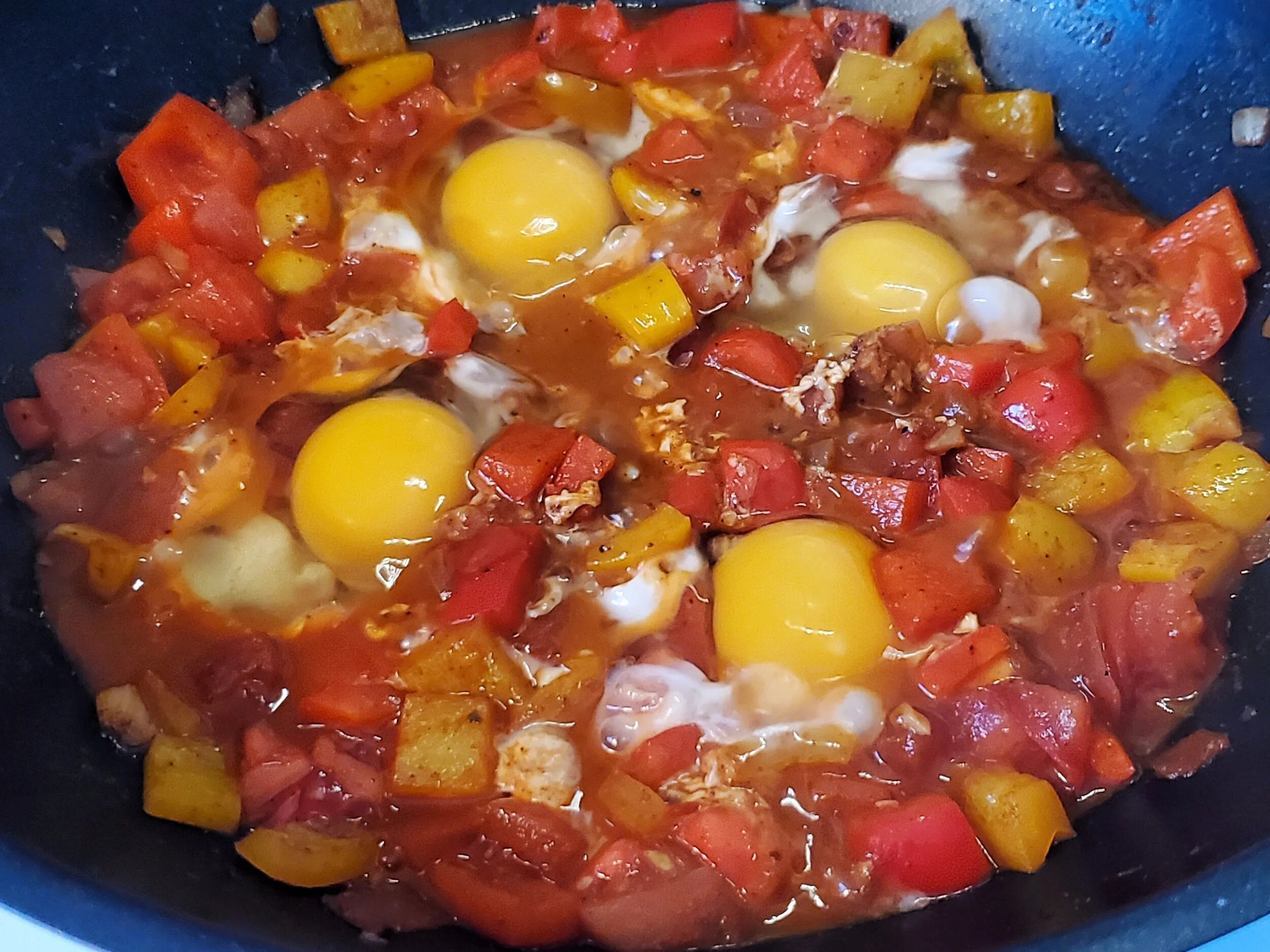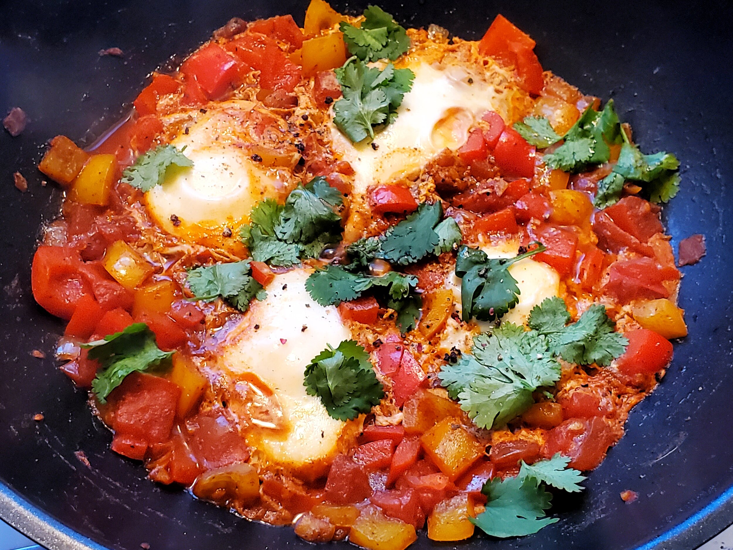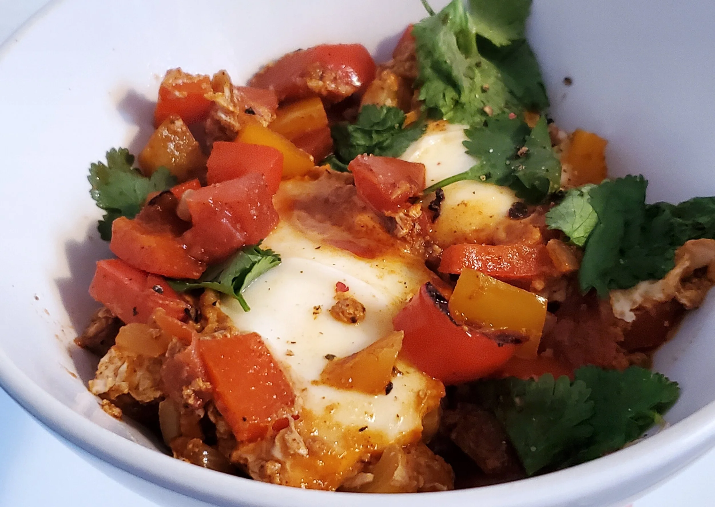 The eggs are poached in a blend of tomatoes and bell peppers, and the whole dish is fragrant with welcoming spices.