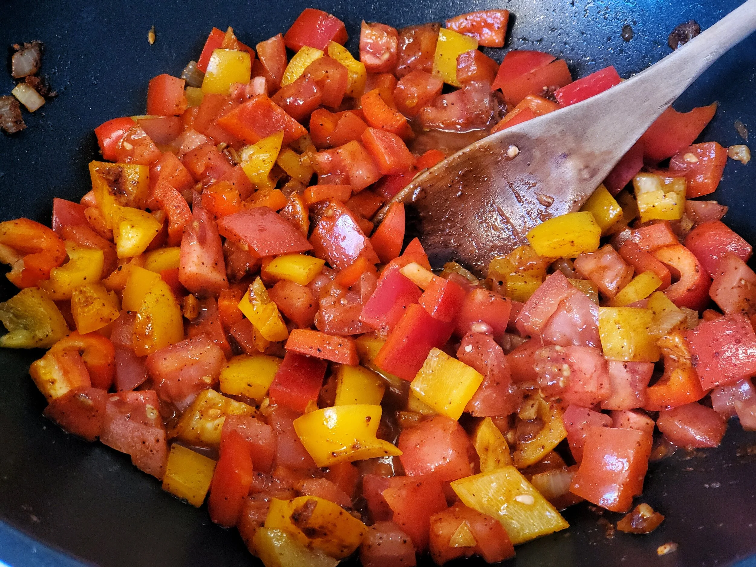 - Add the diced bell peppers and tomato, then the water and bring to a low boil. Allow the mixture to simmer 8-10 min, to thicken.
