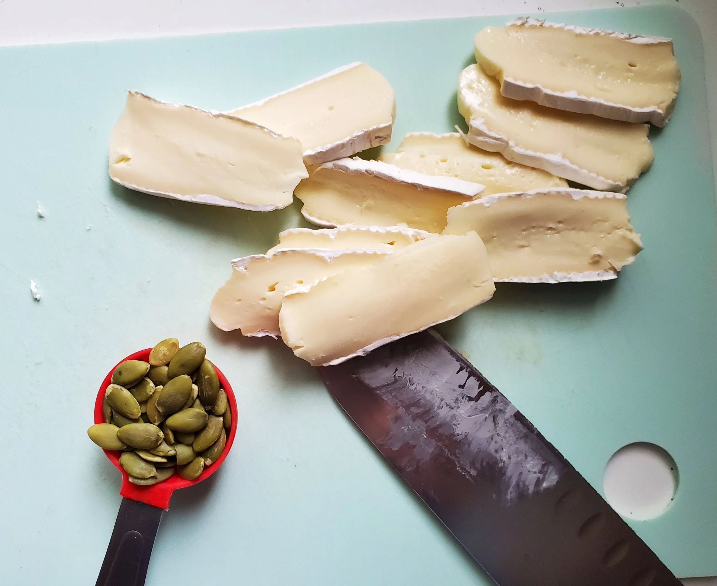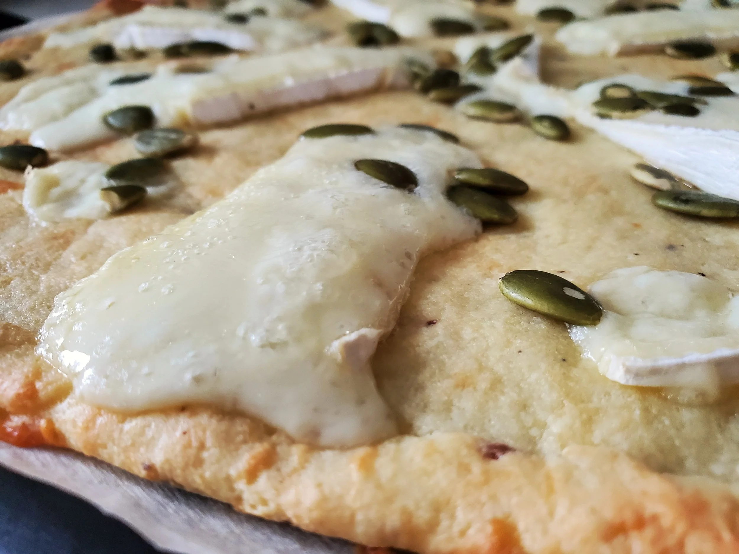 - Pull the pizza dough the oven and top it evely with the brie and pepitas.