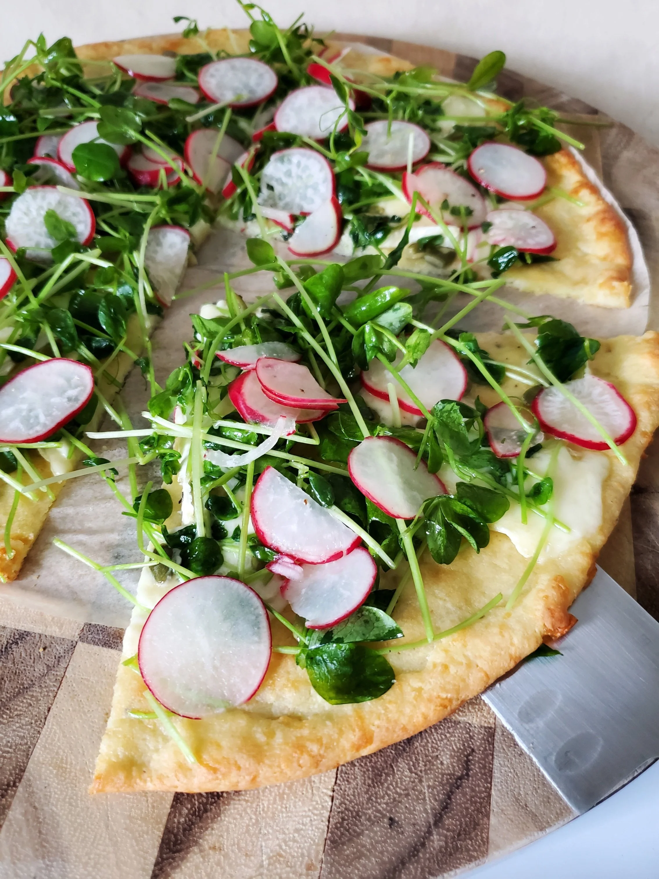 - While the crust bakes, in a large bowl, toss together the pea shoots, radishes, olive oil and white wine vinegar, season to taste with salt and pepper, and set aside.