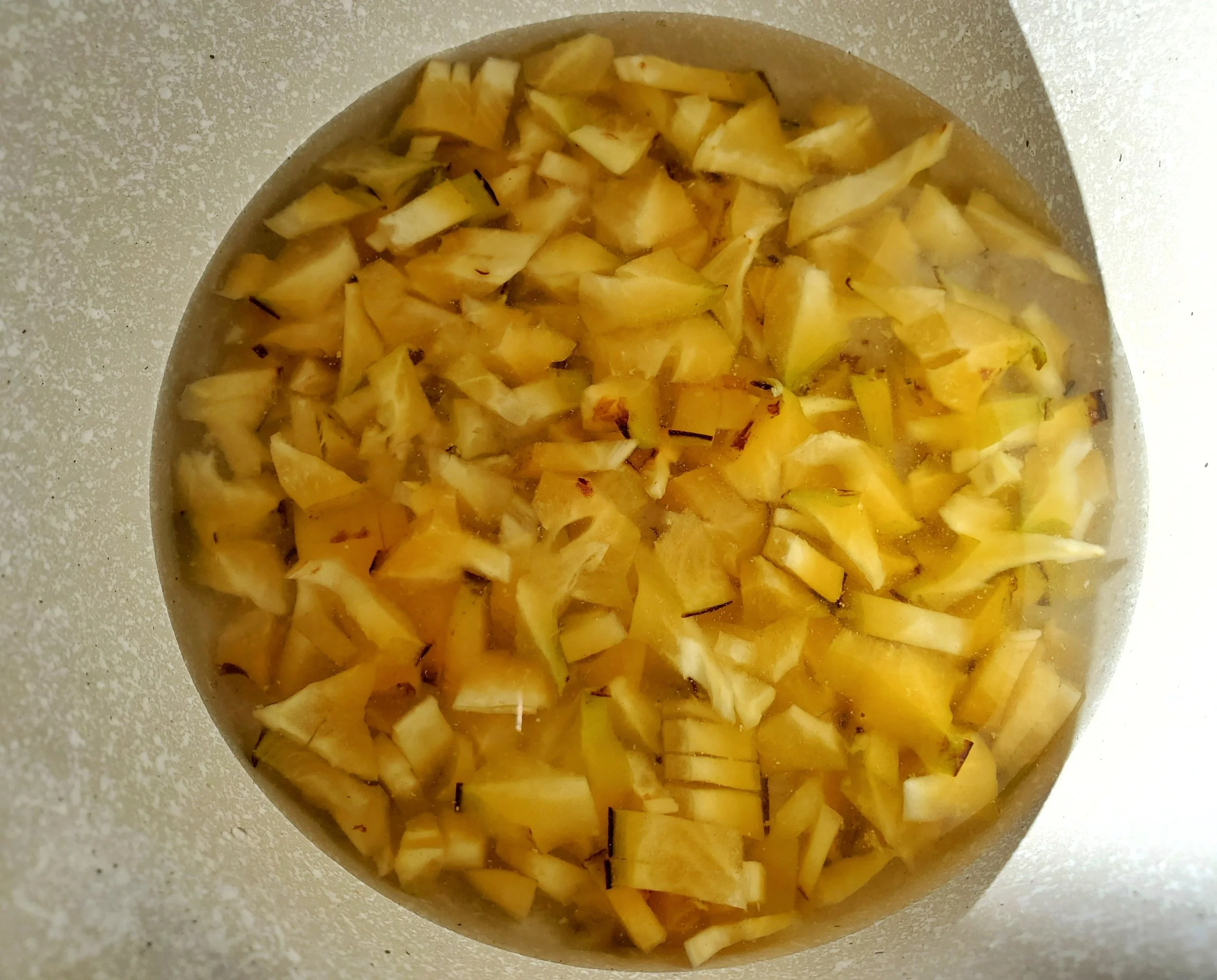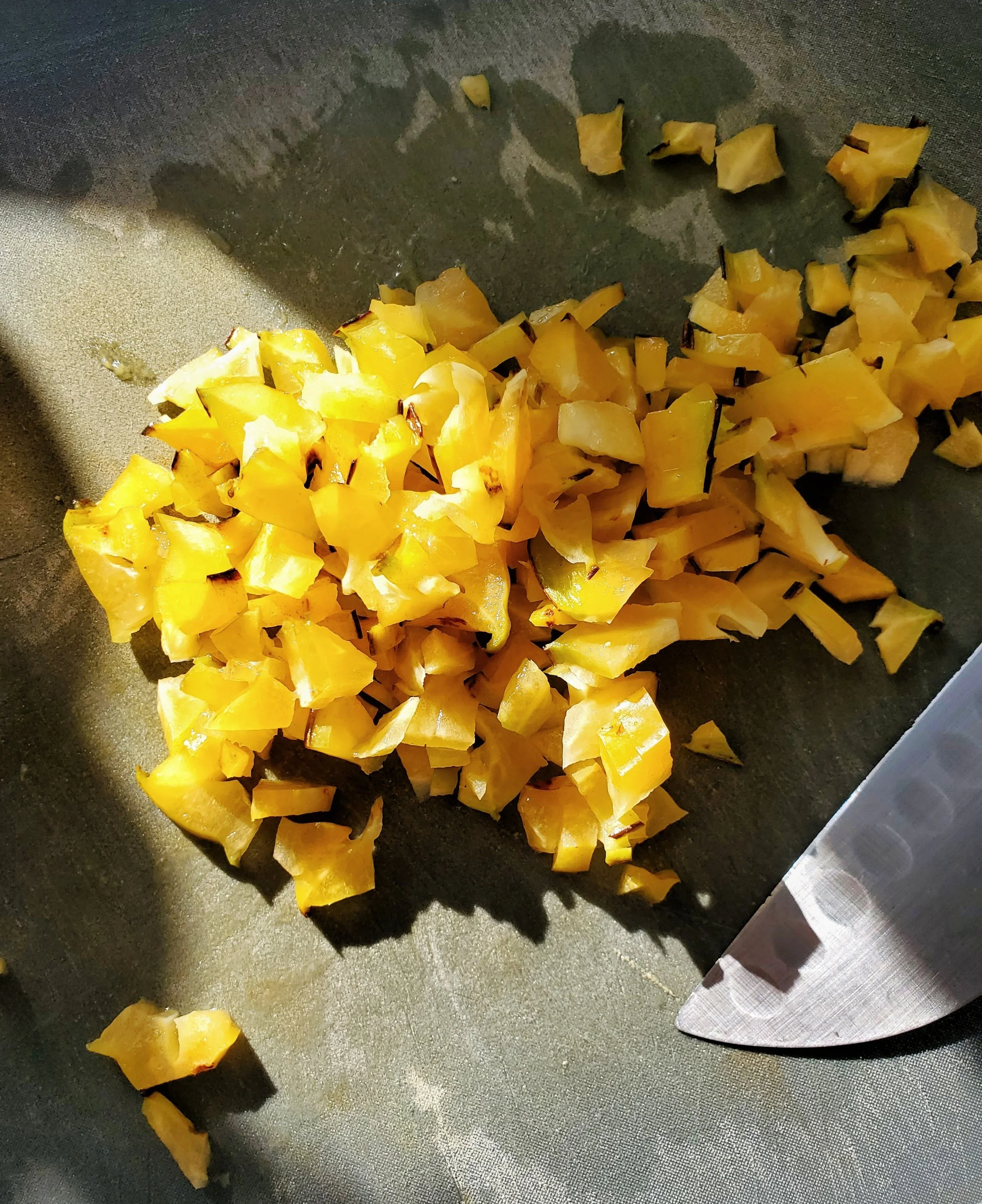 - Wash the starfruits, then cut into quarters length-wise and remove core with seeds, then dice the fruit into small cubes, about 1/4 inch.