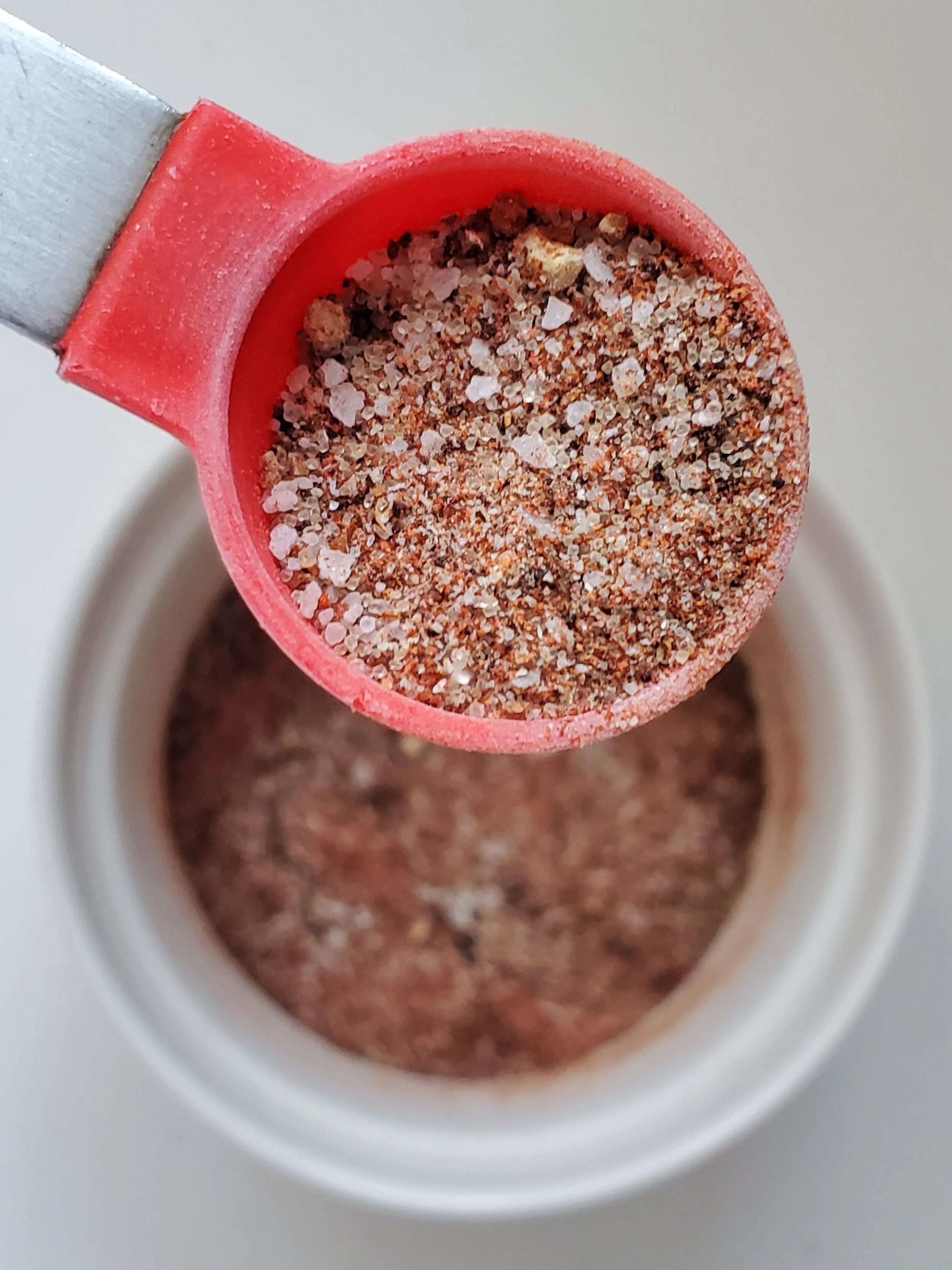 - Prepare the dry rub by mixing together the spices in a small bowl.